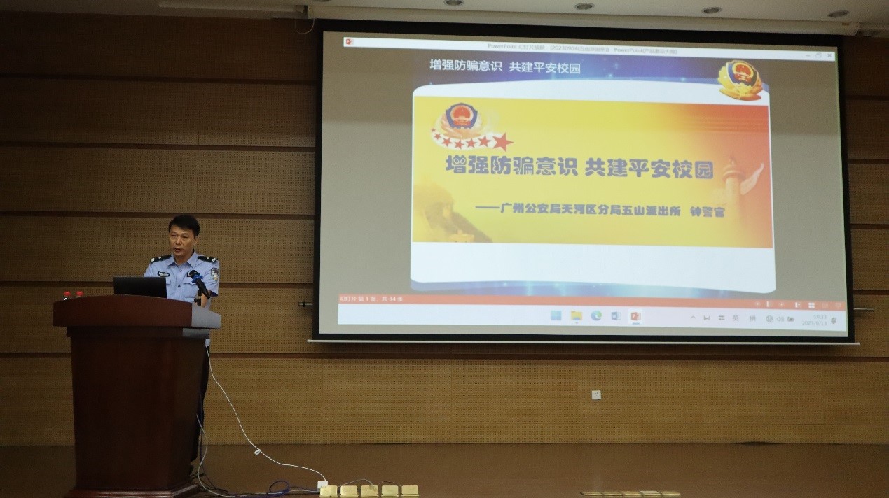 天河分局五山街派出所民警钟送荣通过分享发生在同学们身边的诈骗案例,深入浅出地介绍了常见的诈骗手法,教授相关法律知识和防诈骗常识,切实防范校园违法犯罪行为。