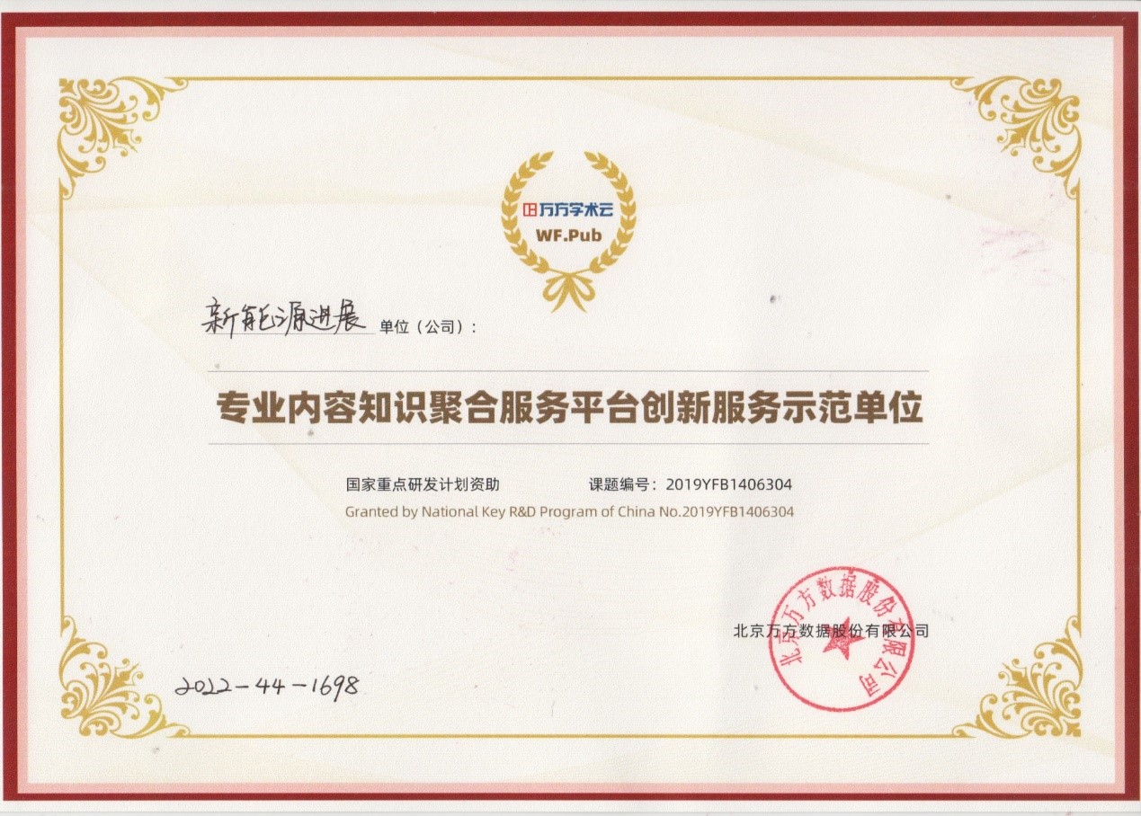 近日,《新能源进展》被北京万方数据股份有限公司评为“专业内容知识聚合服务平台创新服务示范单位”。