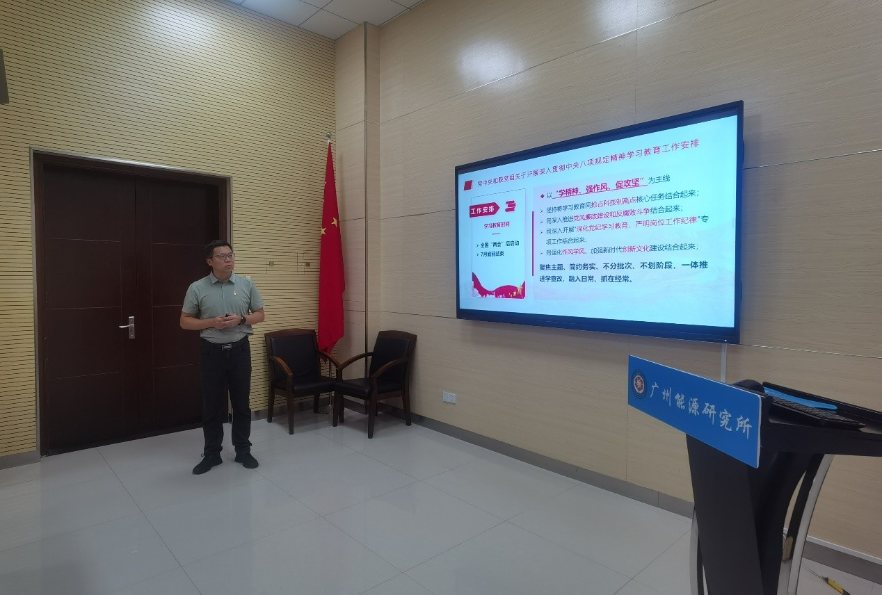 5月15日下午,地热与节能党支部召开党员大会,深入贯彻中央八项规定精神学习教育,推进作风建设与科研工作深入有机融合。党委副书记、纪委书记侯红明,党委委员、党委办公室主任向银花受邀参加会议。 支部书记宋文吉作题为《将中央八项规定精神融入中心科研工作》的党课,从专题教育精神学习、地热能与节能技术研究中心工作进展汇报、党建科研融合发展等三个方面展开深入剖析,围绕中心科研工作重点,聚焦地热能、工业节能、储能及能源材料等重点方向,鼓励中心全体党员踔厉奋发,争做眼中有光、肩上有责、手上有招、脚下有路的新时代“四有”新青年。 会上,侯红明强调,党支部要充分发挥战斗堡垒作用,以党建引领科研创新,把握时代机遇、勇攀科技高峰;以科学管理激发团队活力,完善制度保障;以文化凝聚共识,畅通反馈渠道,共同推动研究所文化建设迈上新台阶。他指出党支部应当抓住发展机遇,争做节能降碳综合解决方案的“设计者、集成者、制造者、引领者”,为我国“双碳”目标的实现做出建设性贡献。