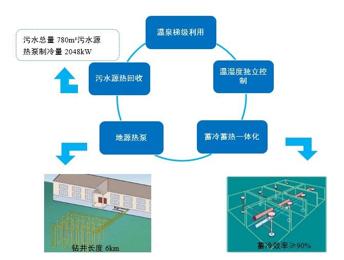 研究了区域综合体能用互补与梯级级利用技术,在湖南总工会灰汤疗养院区域综合体进行了示范应用,综合体建筑包括洒店、疗养楼、医院、宿舍、会议中心、温泉等不同功能建筑,面积7万平方米,能源互补与梯级利用设计方案如图所示。