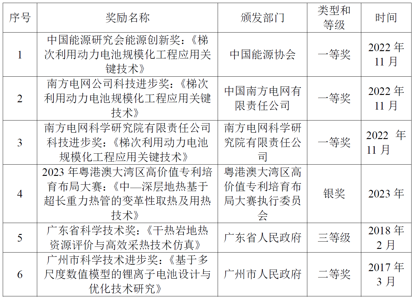 研团队在基于超长重力热管技术的中深层地热开发、锂离子电池多尺度多场耦合仿真、锂离子电池电热及安全管控、燃料电池水热管理等领域构建了完善的关键技术体系并实现了应用示范,取得了一系列研究成果。 1.论文 截至2024年,科研团队发表论文213篇,其中SCI/EI论文179篇。 代表性论文如下: Huang W, Chen J, Ma Q, et al. Developing kilometers-long gravity heat pipe for geothermal energy exploitation[J]. Energy & Environmental Science, 2024, 17(13): 4508-4518. (IF: 32.4) Chen J, Li Z, Huang W, et al. Super-long gravity heat pipe geothermal space heating system: A practical case in Taiyuan, China[J]. Energy, 2024, 299: 131521. (IF: 9.0) Qiu Y, Peng P, Jiang F. Improvement of local outlier factor algorithms for lithium-ion battery fault diagnosis[J]. Journal of Energy Storage, 2024, 98: 113100. (IF:8.9) Anand R S, Li A, Huang W, et al. Super-long gravity heat pipe for geothermal energy exploitation-A comprehensive review[J]. Renewable and Sustainable Energy Reviews, 2024, 193: 114286. (IF: 16.3) Guo J, Li Z, Wei L, et al. A novel thermal management system with a heat-peak regulator for fuel cell vehicles[J]. Journal of Cleaner Production, 2023, 414: 137712. (IF: 9.8) Cao W, Huang W, Chen J, et al. Numerical study on the heat extraction performance of enhanced geothermal systems with a well-fracture-reservoir combined model[J]. Renewable Energy, 2023, 202: 370-380. (IF: 9.0) Peng P, Wang Y, Jiang F. Numerical study of PCM thermal behavior of a novel PCM-heat pipe combined system for Li-ion battery thermal management[J]. Applied Thermal Engineering, 2022, 209: 118293. (IF: 6.1) Huang W, Cen J, Chen J, et al. Heat extraction from hot dry rock by super-long gravity heat pipe: A field test[J]. Energy, 2022, 247: 123492. (IF: 9.0) Dafalla M A ,魏琳 ,廖梓豪 , et al.夹紧压力对PEMFC冷启动性能的影响[J].工程热物理学报,2022,43(04):1004-1012. (EI) Ibrahim A, Jiang F. The electric vehicle energy management: An overview of the energy system and related modeling and simulation[J]. Renewable and Sustainable Energy Reviews, 2021, 144: 111049. (IF: 16.3) 曹文炅, 雷博, 史尤杰, 等. 韩国锂离子电池储能电站安全事故的分析及思考[J]. 储能科学与技术, 2020, 9(5): 1539. Zhao C, Sousa A C M, Jiang F. Minimization of thermal non-uniformity in lithium-ion battery pack cooled by channeled liquid flow[J]. International journal of heat and mass transfer, 2019, 129: 660-670. (IF: 5.0) Wei L, Liao Z, Suo Z, et al. Numerical study of cold start performance of proton exchange membrane fuel cell with coolant circulation[J]. International Journal of Hydrogen Energy, 2019, 44(39): 22160-22172. (IF: 8.1) Zhao C, Cao W, Dong T, et al. Thermal behavior study of discharging/charging cylindrical lithium-ion battery module cooled by channeled liquid flow[J]. International journal of heat and mass transfer, 2018, 120: 751-762. (IF: 5.0) Wei L, Yuan X, Jiang F. A three-dimensional non-isothermal model for a membraneless direct methanol redox fuel cell[J]. Journal of Power Sources, 2018, 385: 130-140. (IF: 8.1) Chen W, Jiang F. Impact of PTFE content and distribution on liquid–gas flow in PEMFC carbon paper gas distribution layer: 3D lattice Boltzmann simulations[J]. International journal of hydrogen energy, 2016, 41(20): 8550-8562. (IF: 8.1) Chen J, Jiang F. Designing multi-well layout for enhanced geothermal system to better exploit hot dry rock geothermal energy[J]. Renewable Energy, 2015, 74: 37-48. (IF: 9.0) Jiang F, Peng P, Sun Y. Thermal analyses of LiFePO4/graphite battery discharge processes[J]. Journal of power sources, 2013, 243: 181-194. (IF: 8.1) 吴伟, 蒋方明, 曾建邦. LiCoO2电池正极微结构重构及有效传输系数预测[J]. 物理化学学报, 2013, 29(11): 2361-2370. (IF: 10.8) 曾建邦, 蒋方明. 锂离子电池介观尺度光滑粒子水力学模型[J]. 物理化学学报, 2013, 29(11): 2371-2384. (IF: 10.8) 2.专利 截至2024年,科研团队申请专利73件,授权46件,其中PCT4件。 代表性专利如下: PCT/CN2021/116886,一种利用地热井实现高效蒸发的热泵系统及方法 PCT/CN2021/118084,一种热管式取热集成冷电热联用的采-用一体化地热系统 EP3961122,无积液效应的阶梯式重力热管地热开采系统 60861AU,一种热管式取热集成冷电热联用的采用一体化地热系统 ZL202110227305.6,结合超长重力热管取热控温的高温矿井综合改造利用系统 ZL 202110235939.6,一种水热型地热综合利用系统及能量分配管控方法 ZL202110453266.1,一种锂电池储能系统液冷消防联合管控系统及管控方法 ZL201910180385.7,一种用于电动汽车的热管理系统 ZL202011247915.4,一种用于无人机燃料电池的散热系统 ZL201910673309.X,一种锂电池热-安全管理系统及管控方法 ZL202110227305.6结合超长重力热管取热控温的高温矿井综合改造利用系统 ZL201910328413.5,无积液效应的阶梯式重力热管地热开采系统 ZL201610877704. 6,一种锂离子电池组全天候有效热管理系统 3.软件著作权 截至2024年,科研团队授权软件著作权27件。 代表性软件著作权如下: 2022SR1516823,基于局部异常因子的锂离子电池组数据驱动诊断软件 2021SR0814899,基于熵的锂电储能系统故障诊断与不一致性监控软件 2021SR1230709,基于井筒等效模型的地热系统数值仿真软件 2019SR0310213,质子交换膜燃料电池冷启动时催化层内多场耦合的介孔尺度仿真软件 2019SR0310198,含冷却循环的质子交换膜燃料电池冷启动过程数值仿真软件 2018SR778015,电动汽车锂离子电池组液冷系统热仿真软件 2017SR665533,无膜直接甲醇氧化还原燃料电池内电化学耦合多物理传输过程的数值仿真软件 2014SR037600,增强型地热系统地下传热传质过程三维全区域动态模拟软件 2014SR61792,增强型地热