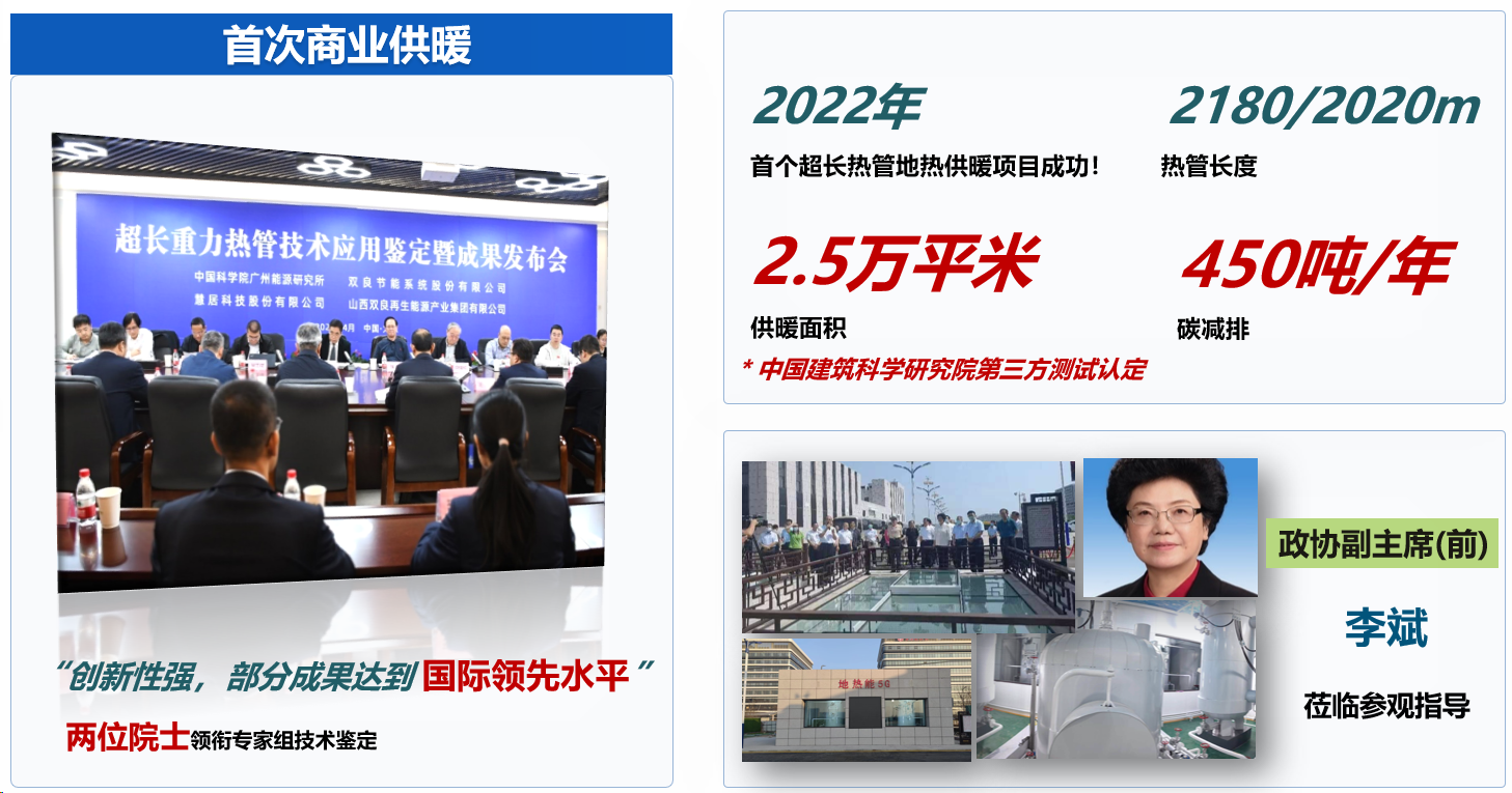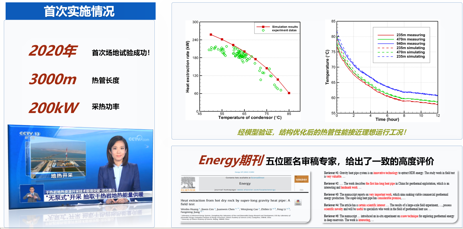 1. 科研团队研发了超长重力热管,在河北唐山马头营一口地热深井内完成安装并开展了长达4个月的采热试验,尝试开展了地热温差发电试验。试验结果显示,在地下取热段岩石平均温度为119oC的地热条件下,地面获得了温度最高达90oC的饱和水蒸汽,持续采热功率接近200千瓦。在世界范围首次实现中深层地热资源“只取热、不取水”的“无泵式”开采,取得了中深层地热开发技术重大突破,为地热资源利用开辟了新模式、新路径。