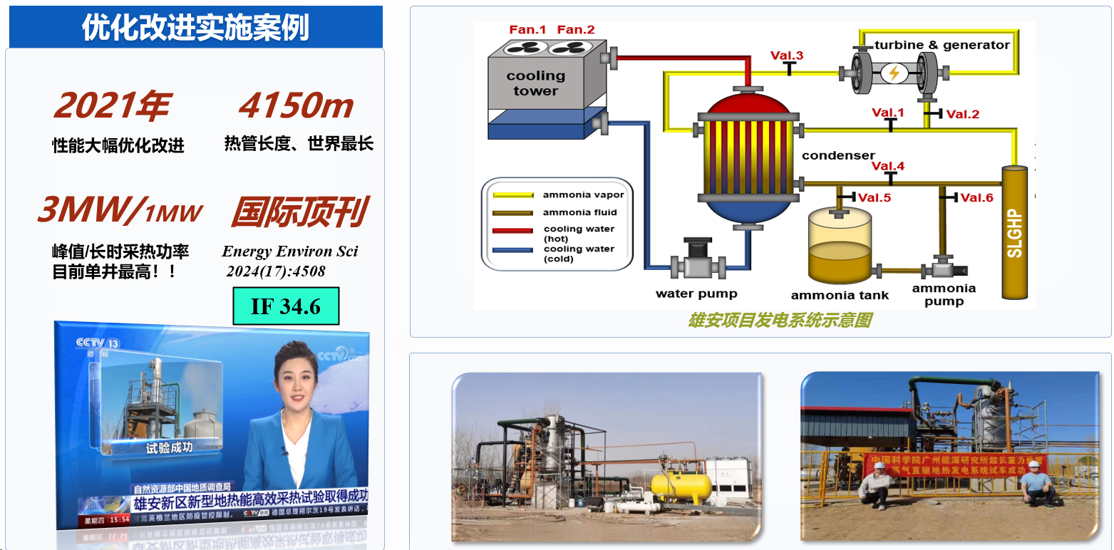3. 科研团队研制了一根以氨作为工质的4150 m长度的重力热管并安装在河北雄安一口地热深井内。取热实验证明了该SLGHP地热系统的连续热产出可以超过1 MW,热管径向截面的热通量达4×107 W/㎡。此外,研究团队还提出了热管蒸汽直驱发电的地热发电技术方案,首创热管产出氨蒸汽直接驱动的地热发电机组,并与热管地热开采系统集成。基于该原理研制的样机在72小时发电测试中能够以大约7 kW功率稳定发电,确证了该地热发电技术路线的可行性。