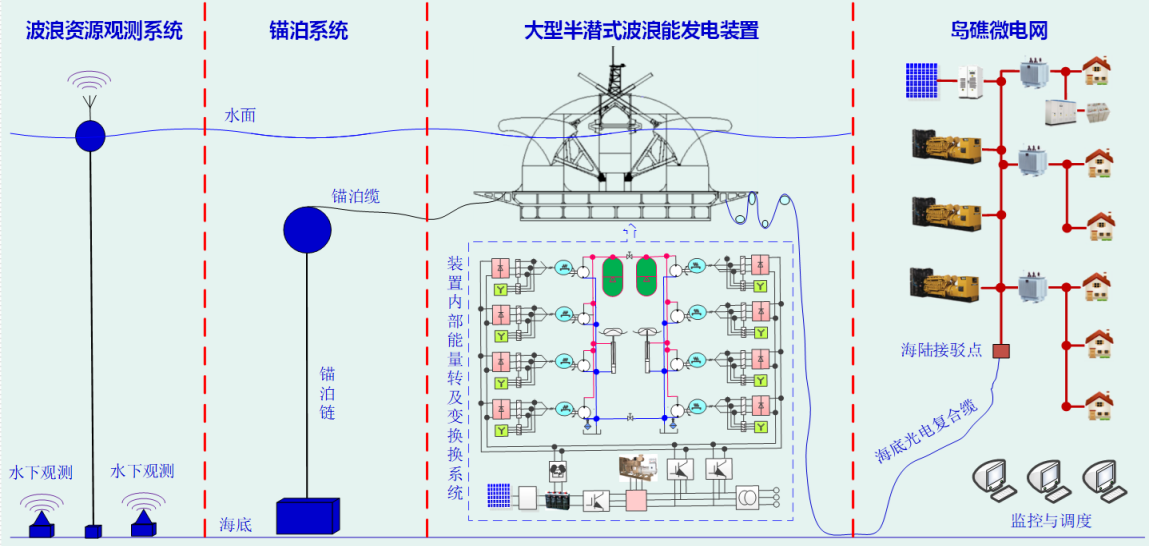 (4)海上及海岛多能互补系统集成(多能互补平台、海岛独立电力系统) 建造百千瓦-兆瓦级海洋可再生能源平台,投放岛屿,形成波浪能发电场,并入海岛微网,实现长期持续供电,支撑岛屿经济发展。积极开展波浪能+海上风电,由波浪能驱动的深海养殖网箱及大洋科考站预研,服务国家南海重大战略,形成重大示范效果。