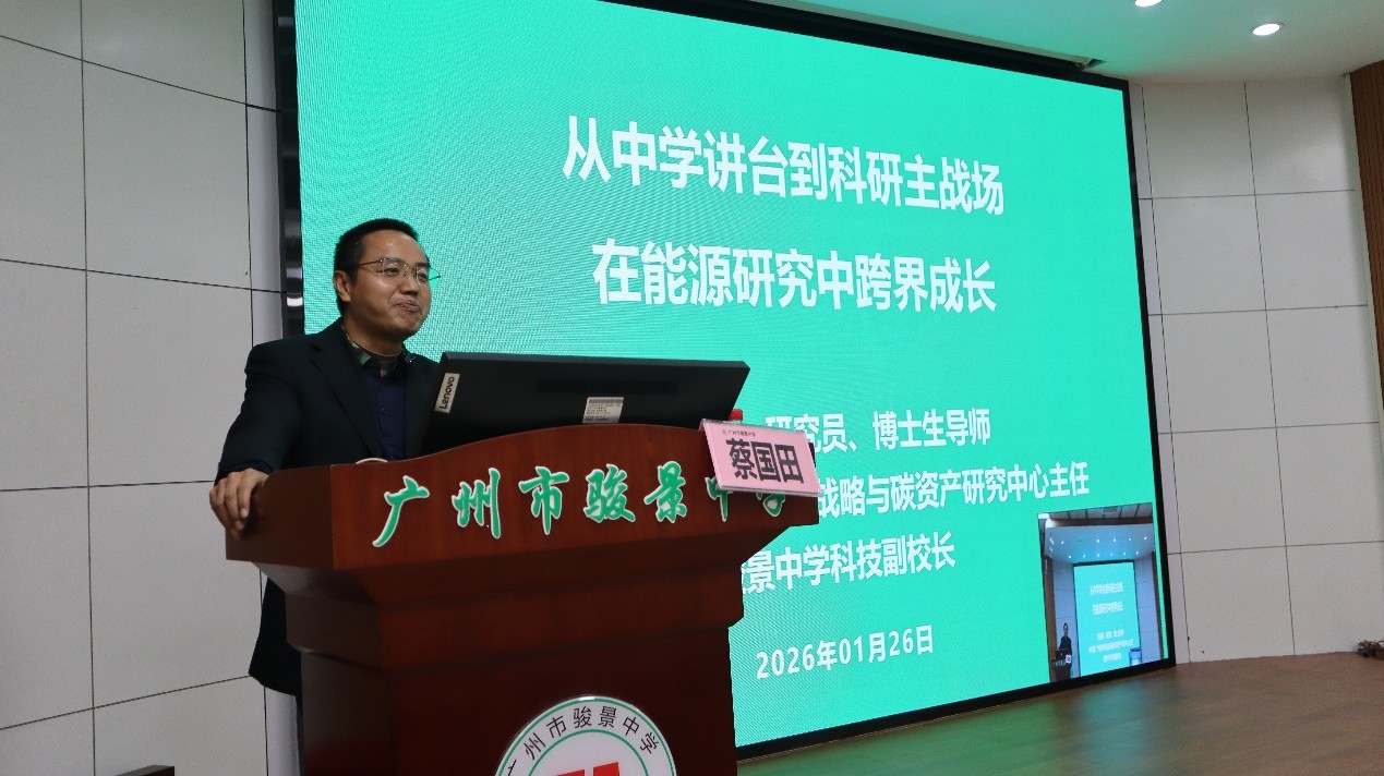 1月26日下午,德彩网能源战略与碳资产研究中心主任蔡国田研究员受邀在广州市骏景中学作科普讲座《从中学讲台到科研主战场 在能源研究中跨界成长》。150余名学生现场听取讲座,全校师生通过直播收看。