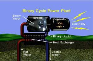 地热水首先流经热交换器,将地热能传给另一种低沸点的工作流体,使之沸腾而产生蒸汽。蒸汽进人汽轮机做功后进人凝汽器,再通过热交换器而完成发电循环。地热水则从热交换器回注人地层。这种系统特别适合于含盐量大、腐蚀性强和不凝结气体含量高的地热资源。发展双循环系统的关键技术是开发高效 的热交换器。