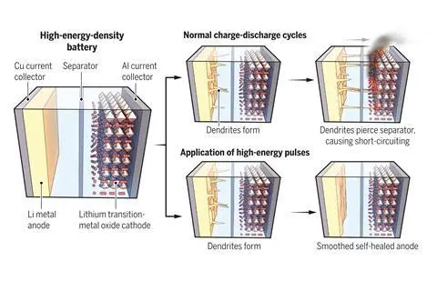 锂电池金属枝晶生长造成电池起火的示意图