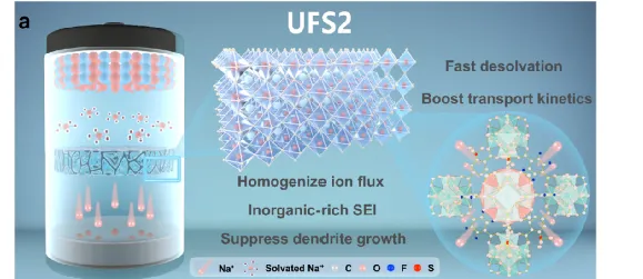 最左侧为钠金属电池的示意图,中间层为隔膜,放大部分为经过修饰的MOF-UFS2结构图