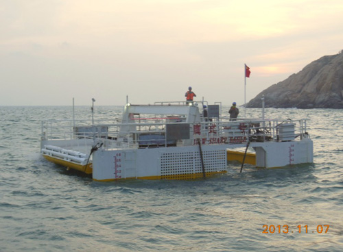2013年第30号超强台风“海燕”已于11月8日晚进入南海东南部海面,快速向西沙群岛和海南南部沿海靠近。受其影响,9日至11日广东省沿海海面风力7-9级,南海大部海面风力8-10级,其中“海燕”中心经过的附近海面风力13-15级。有报道称,该台风为史上最大台风。 11月7日,德彩网在珠海万山海域投放经过修检的波浪能发电装置“鹰式一号”,波浪能装置顺利投放后即刻发电。该装置装机容量为10kW,启动波高为0.5m,最大工作波高2.5m。11月10日, 受“海燕”台风影响,波能装置投放海域波高超过2m,“鹰式一号”装置遭遇台风强浪,台风浪经过装置击向岸边悬崖形成超过10m高的白浪,而装置依然正常发电。11月11日,万山海域依旧风大浪大,鹰式装置浮态正常,平稳工作。 “鹰式一号”波能装置经过此次台风强浪的考验,验证了该装置结构设计的合理可靠性,也说明了该装置具有较强的抗台风能力,同时也为海洋波浪能发电装置的抗台风研究提供了珍贵的数据和经验。