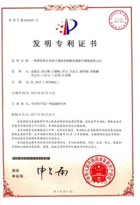 生物柴油不含硫和芳烃、十六烷值高、润滑性好,是一种优质的清洁柴油。传统的生物柴油制备工艺,多采用硫酸或氢氧化钠等均相酸碱为催化剂,该方法虽然高效,但该类催化剂难以回收重复利用,产品需要中和洗涤,副产物甘油分离精制困难,酸碱污染严重,以上问题严重制约了生物柴油的绿色工业化发展。因此,寻找高效环保的催化剂对生物柴油工业化发展具有十分重要的意义。 离子液体作为一种新型的环境友好型酸碱催化剂,拥有液体酸碱的高密度反应活性位和固体酸碱的不挥发性,同时它的结构和酸碱性可调,与传统酸碱催化剂相比,腐蚀性低,过程清洁,稳定性高,转化率高,易与产物分离,可重复使用,是真正意义上的绿色溶剂和催化剂,近年来受到人们的广泛关注。但现有采用的离子液体对反应底物溶解性差,油脂与短链醇基本不互溶,生物柴油制备过程,是一个典型的非均相酯化反应,反应速率慢,反应时间长,且离子液体在室温下为液态,离子液体催化剂需要蒸馏精细回收才能够重复利用,后处理工艺长。 中科院德彩网生物质能生化转化研究室利用离子液体具有很强的可塑性,开发出一种在室温条件下为固态,加热到80℃以上熔融成液体,对油脂和短链醇溶解性好的离子液体。在生物柴油制备过程中,离子液体即作为催化剂又作为反应底物的增溶剂,使反应体系呈相溶的“一相”状态,进而有利于反应进行。反应结束后,通过冷却,离子液体结晶析出,其增溶作用也随之消失,反应体系转变成以离子液体为“固相”,生物柴油为主并溶解有少量未反应的油脂原料的“油相”以及以甲醇和甘油组成的“醇相”3个异相。反应后的体系经过滤和倾析就很容易进行分离,解决了现有技术中离子液体对底物的溶解性差,油脂与短链醇基本不互溶,反应速率慢,反应时间长,离子液体需要蒸馏回收等问题。 该成果已获得国家发明专利授权(一种增溶易分离离子液体均相催化制备生物柴油的方法,专利号:ZL 201510078892),其工艺操作简单方便、反应速度快、转化率高、产物易分离纯化,催化剂离子液体价可重复使用、腐蚀性低、不污染环境,绿色环保,能快速制备生物柴油,能大大提高生产效率,降低生产成本,具有较好的工业化应用前景。