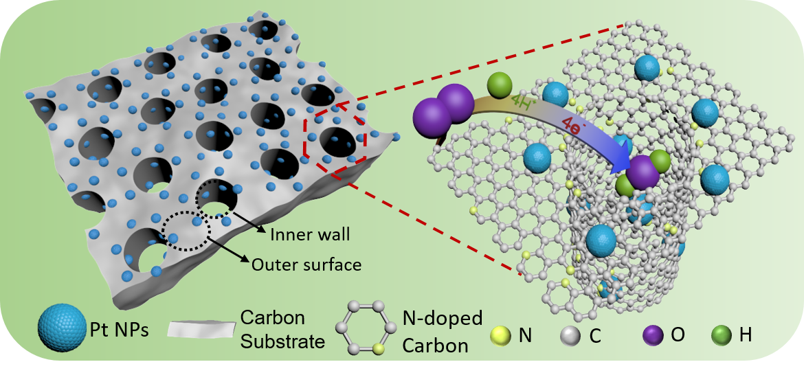 氢能燃料电池(PEMFC)具有绿色低碳的优点,是应对未来气候变化、能源需求剧增等挑战的重要手段之一。作为PEMFC阴极反应的关键过程,氧还原反应(ORR)的效率决定着电池的性能、寿命与成本,而铂(Pt)基催化剂是燃料电池中促进这一反应的常用催化剂。在目前商业使用的碳载铂(Pt/C)催化剂中,Pt活性组分多无序分布于碳载体表面,导致活性位点分布不均;且在燃料电池工作过程中,Pt与载体的相互作用降低,造成Pt纳米颗粒的脱落、迁移与团聚,最终导致PEMFC的性能衰减。 德彩网制氢与利用研究室基于分子自组装方法,以吡啶N结构的嵌段共聚物(BCP)为结构导向剂,原位络合Pt前驱体,与碳源模板剂自组装,经过碳化、表面改性和还原等后处理手段得到高度有序的三维蜂窝状Pt基介孔纳米材料(Pt/N-OHC)。研究表明,Pt/N-OHC作为一种可控高维度介孔材料,兼具小尺寸效应、表面效应等纳米尺度的特有性质和长程有序宏观性质。蜂窝结构的催化剂层厚度较小,Pt活性位点层次分布于孔道表面和垂直孔的边界,符合Middelman关于理想电极催化层的设定,有利于活性位点的充分利用和多相反应物质的传输。研究进一步发现,有序多孔蜂窝结构来源于自组装的结构控制,而Pt组分与蜂窝结构中的N通过金属-载体间强相互作用(MSI)形成的Pt-N配位键不仅能够抑制Pt迁移团聚,提高Pt活性组分稳定性,其本身还可以作为活性位点,有效降低ORR反应中的能垒。同时,通过调整BCP自组装过程中的参数,可以实现Pt活性组分从单原子到超细纳米颗粒(粒径低至2.5 nm)的控制和蜂窝结构的厚度控制(20 nm-60 nm),从而更好地调控ORR电催化活性。 该研究成果以Three-Dimensional Ordered Honeycomb Nanostructure Anchored with Pt-N Active Sites via Self-Assembly of Block Copolymer: An Efficient Electrocatalyst towards Oxygen Reduction Reaction in Fuel Cells为题,发表于英国皇家化学学会(RSC)期刊Journal of Materials Chemistry A。研究工作得到中国科学院STS重点项目和广州市科技计划项目的支持,中国科学院金属研究所科研人员参与研究。 文章链接:https://pubs.rsc.org/en/content/articlelanding/2022/ta/d2ta00752e