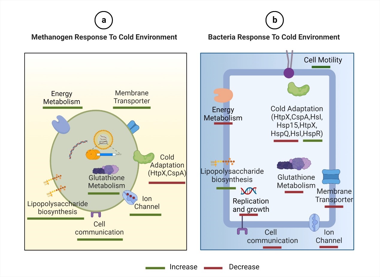 实验设计 具体研究结果如下: 低温抑制厌氧发酵的主要原因。相比于细菌,古菌(主要指产甲烷菌)对低温更敏感,能够引起反应器内中间代谢产物产生和降解速度不平衡,造成挥发性脂肪酸累积和甲烷产量低;此外,细菌和古菌对温度的响应也存在差异,利用宏组学技术结合KEGG代谢通路数据库,发现古菌中仅编码两种耐冷基因(Htpx, CspA)(图1a),但细菌中编码多种耐冷基因,如HslJ,Hsp15, CspA, MerR, HtpX, HspQ(图1b),说明古菌的耐冷能力较差,导致古菌倍增速率明显低于细菌。因此提高反应器中产甲烷菌的丰度及其耐冷能力是促进低温产甲烷的关键。 图1. 低温对厌氧消化微生物代谢的影响 a) 产甲烷菌;b) 细菌