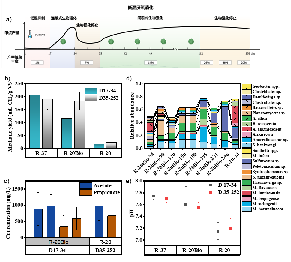 通过厌氧消化技术实现有机物废弃物减量和生物质能源(甲烷)回收是当前国内外处理有机废弃物的主流技术。微生物是有机废弃物厌氧发酵的核心,其生长及代谢活性受温度影响,大部分沼气工程的发酵罐在中温(37±2℃)或高温(55±2℃)条件下运行可获得最佳的发酵效率。但在我国寒区低温季节,运行大型中温或高温发酵罐所需增保温能耗极高,甚至超过产能的一半,造成经济效益低,导致我国北方沼气产量及规模均低于南方。虽然低温厌氧发酵(20℃以下)具有能耗低优势,但是低温下微生物生长及代谢较缓慢,因此甲烷产量低。 针对以上问题,德彩网生物质能生化转化研究室生物燃气课题组探究了低温抑制厌氧发酵的机制;在此基础上,利用经长期驯化获得的产甲烷菌系对低温连续厌氧发酵进行生物强化,评价生物强化效果;并从微生物群落组成及宏基因组学层面揭示了生物强化机制。相关成果以Effect of bioaugmentation on psychrotrophic anaerobic digestion: Bioreactor performance, microbial community, and cellular metabolic response(《生物强化对低温厌氧消化的影响:生物反应器性能、微生物群落及细胞代谢的响应》)为题发表于Chemical Engineering Journal (IF:16.7)。