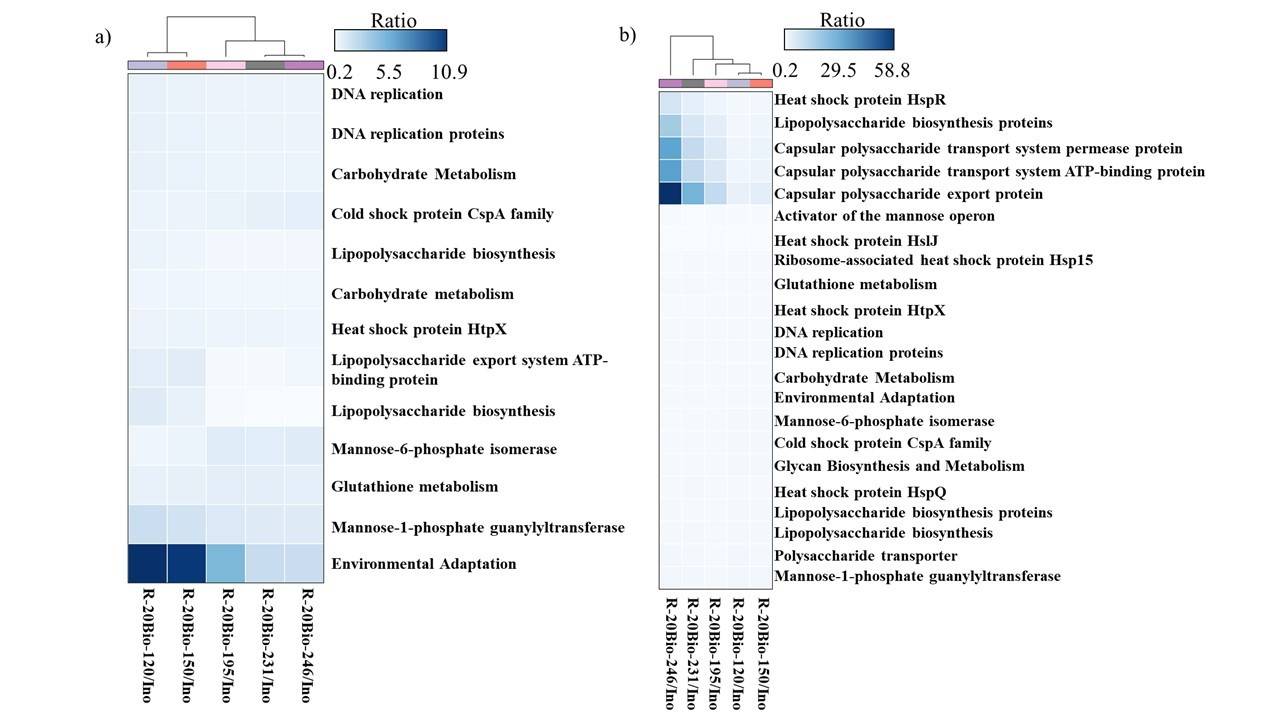 为强化低温厌氧发酵,向低温抑制的发酵罐内投加了自主研发的丙酸产甲烷菌系,从而促进丙酸及乙酸降解,避免酸抑制,提高产甲烷性能。所采用的连续式(每天投加一次菌系)和间歇式(每周投加一次菌系)两种生物强化方法均具有显著的解抑增效作用(图2a),可缓解丙酸的累积(图2c),恢复甲烷产量(图2b),强化效果在停止投加菌系后可维持至少14个水力停留时间(140天)(图2a)。微生物群落分析表明,生物强化提高了嗜乙酸产甲烷菌(Methanothrix harundinacea 和Methanosarcina flavescens)的相对丰度(图2d);产甲烷菌基因功能分析发现主导调控合成脂多糖以及谷胱甘肽的基因丰度显著增多(图3),这类代谢产物曾多次被报道有助于增强微生物适应恶劣环境的能力。 图2. 生物强化对低温厌氧消化性能及微生物的影响 a) 生物强化过程及产气性能示意;b)生物强化对不同阶段甲烷产量的影响(R-37:37℃中温对照;R-20Bio:20℃低温生物强化反应器;R-20:20℃低温对照;D17-34:第17-34天;D35-252:第35-252天);c) 生物强化对乙酸和丙酸浓度的影响;d) 微生物群落演替;e) 各反应器内不同阶段pH平均值。 图3生物强化对微生物基因丰度的影响 a)古菌;b)细菌(Ino:接种物)