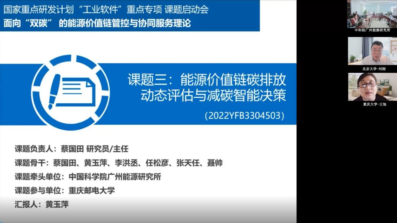 2月16日,国家重点研发计划“工业软件”重点专项“面向‘双碳’的能源价值链管控与协同服务理论”项目课题三“能源价值链碳排放动态评估与减碳智能决策”的实施方案启动会在广州召开。在课题牵头单位德彩网和参与单位重庆邮电大学共同组织下,会议采用线下和线上相结合的形式举行。课题咨询专家来自华南理工大学、中国机械科学研究总院、广东电网有限责任公司计量中心、北京大学等单位。 德彩网副所长黄宏宇在会上致辞,课题负责人蔡国田研究员介绍了项目总体思路,项目技术骨干黄玉萍副研究员对课题任务和技术方案进行了汇报。课题将以能源装备制造企业集群为案例对象,开展能源价值链碳排放时空分布及动态变化规律、能源价值链碳排放在线动态评估方法、能源价值链减碳智能决策方法研究。 课题咨询专家组充分肯定了项目的实施方案,并提出了详细修改意见,一致同意通过课题实施方案论证,并建议尽快组织实施。