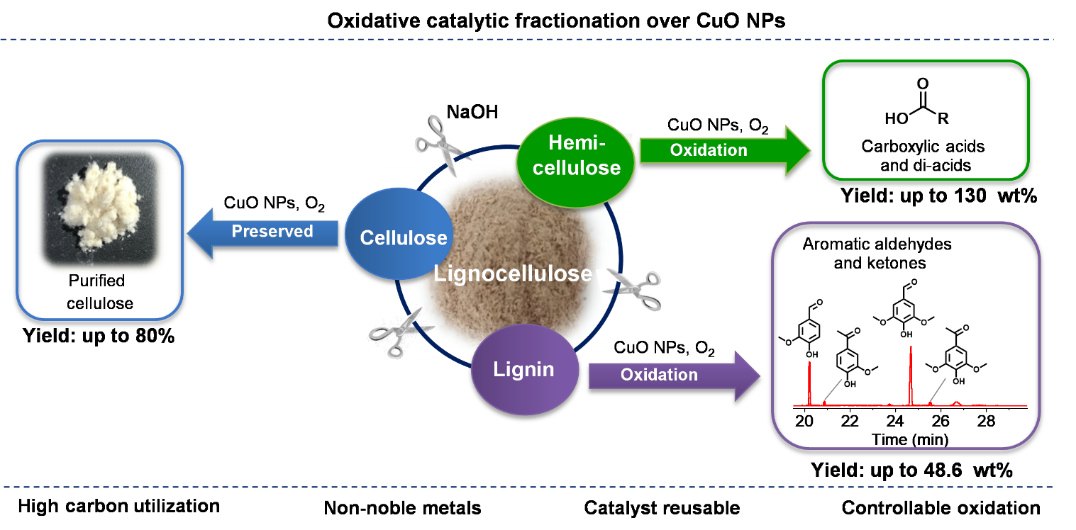 近日,广州能源研究所生物质催化转化研究室王晨光研究员与比利时鲁汶大学Bert F. Sels教授合作,在生物质全组分高值化利用方面取得重要进展。5月30日,相关研究以Oxidative Catalytic Fractionation of Lignocellulose to High-Yield Aromatic Aldehyde Monomers and Pure Cellulose为题以长文(Research Article)形式在线发表于《ACS-催化》(ACS Catalysis)。 温和氧化是一项具有应用前景的生物质催化转化技术,可将木质纤维素类生物质转化为高价值的化学品和纤维素。然而在此过程中,碳水化合物的溶解和转化以及木质素和单酚类物质的缩聚和降解限制了整体碳效率的提高。 该研究针对上述技术瓶颈,借鉴传统氧碱法造纸除木质素工艺,基于木质素优先利用思路提出催化氧化分离策略并应用于木质纤维素组分分离,同时将木质素氧化转化为高附加值单酚。研究发现,温和条件下成本较低的纳米氧化铜颗粒(CuO NPs)表现出优异的催化氧化分离性能,在将木质素催化氧化为芳香醛酮的同时抑制了纤维素水解,该方法获得的高附加值单体和材料(纤维素)的碳效率达80%(图1)。其中,木质素被转化为芳香单体(主要为香兰素和丁香醛),转化率高达48.6 wt %。通过“分离-氧化”两步实验和模型反应发现,CuO NPs能高效催化木质素苯丙烷侧链C-C键和C-O键断裂,促进木质素氧化中间体亚甲基醌自由基向目标产物芳香醛酮的转化,使单酚收率超过理论值(基于β-O-4键的含量);半纤维素则选择性转化为草酸为主的水溶性小分子脂肪酸;80%的纤维素以白色固体残渣(纤维素纯度高达95%)形式保留。通过模型物反应及13C NMR等表征手段证明,铜阳离子与纤维素的葡萄糖链上的羟基及吡喃环的氧原子的强烈络合作用是抑制纤维素水解的主要原因(图2)。 该论文中提出的催化氧化分离策略普遍适用于木本和草本生物质的催化转化,为今后生物质温和全组分高值化利用提供了指导思路,进一步促进从化石经济向利用生物质生产化学品的更可持续的生物经济的过渡。 该研究获得国家重点研发计划项目、国家青年自然科学基金项目和广东省重点领域研发计划项目的资助。原文链接:https://pubs.acs.org/doi/full/10.1021/acscatal.3c01309