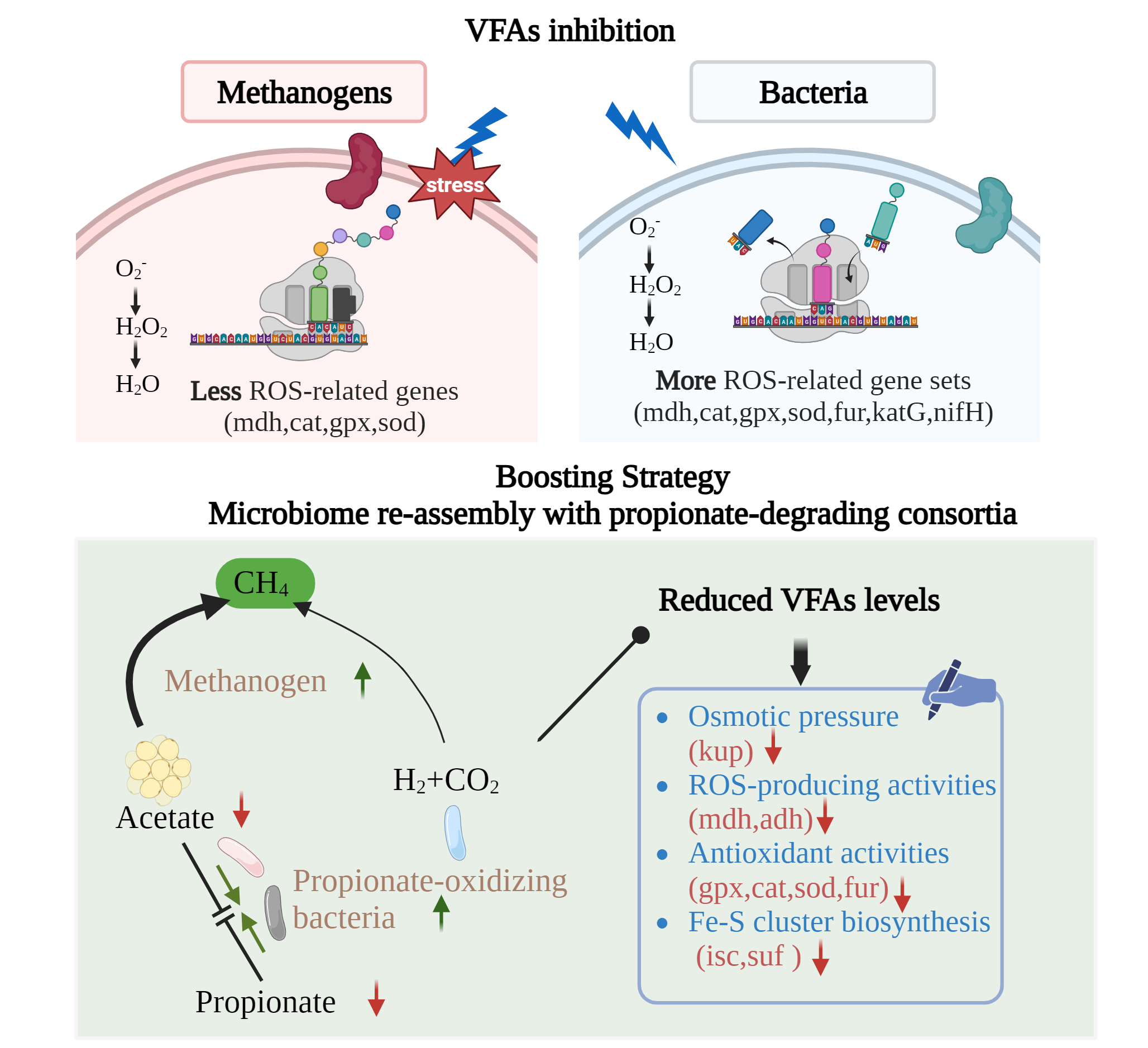 图1. VFAs累积对细菌和产甲烷菌代谢的影响。