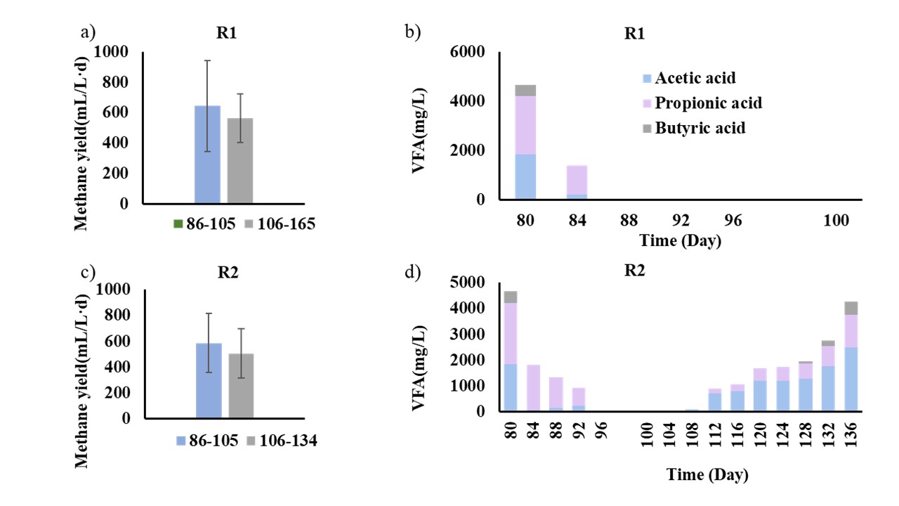 图2.不同组厌氧反应器运行性能示意图:a)R1人工群落重组反应器甲烷产量;b) R1人工群落重组反应器VFAs含量变化;c) R2浓缩菌液强化组反应器甲烷产量;d) R2浓缩菌液强化组反应器VFAs含量变化。