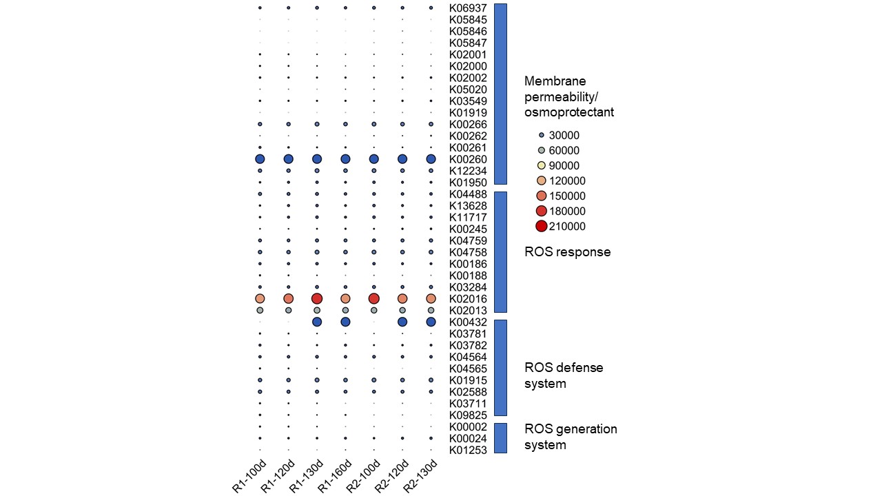 实验结果表明,通过定向投加耐酸产甲烷菌群,反应器R1平均甲烷产率可提高至563.6 159.8 mL/L d,VFAs含量低于检测水平,其强化效果可持续80天以上(图2)。代谢产物及微生物群落分析表明,定向投加的耐酸菌属Syntrophomonas, Syntrophobacter, Methanothrix可以适应VFAs胁迫环境,并显示出成长优势,可以有效加速甲烷化过程(图1);此外基因功能分析表明系统产甲烷菌群内与ROS代谢途径相关的功能基因丰度显著下降(图3)。以上结果表明菌群重组可有效缓解系统内环境压力,恢复甲烷产量。在对照组反应器R2中,添加非驯化的普适性浓缩菌液可短暂性提高甲烷产量,但在48天后迅速崩溃(图2);产甲烷菌群内与ROS代谢相关的基因丰度持续提高(图3),表明反应器内产甲烷菌群不具备压力耐受性,并持续承受环境压力刺激,导致其生理功能抑制或受损。