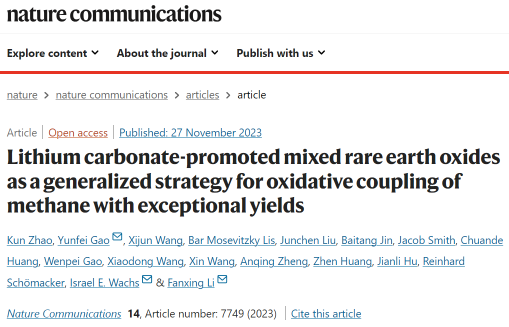 近日,广州能源研究所废弃物处理与资源化利用研究室赵坤副研究员联合美国北卡罗莱纳州立大学等研究团队,报道了一种在以促进剂碳酸锂(Li2CO3)修饰的具有氧化还原活性的复合稀土金属氧化物的催化作用下,实现低温高效化学链甲烷氧化偶联的方法。该催化剂在700 下单程C2+收率高达30.6%,且在甲烷分压高达1.4 atm的条件下仍能表现出稳定的性能。相关研究成果以Lithium carbonate-promoted mixed rare earth oxides as a generalized strategy for oxidative coupling of methane with exceptional yields为题,于近日发表在《自然—通讯》(Nature Communications)。