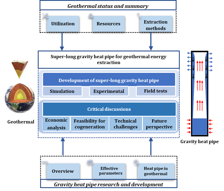 近期,德彩网先进能源系统研究室蒋方明研究员团队在能源领域著名期刊Renewable and Sustainable Energy Reviews发表了题为Super-long gravity heat pipe for geothermal energy exploitation - A comprehensive review的综述论文。 超长重力热管地热系统因其独特的“取热不取水”、无泵式自驱运行等特性以及优良的热输运能力,近年来在地热能开发领域获得广泛关注。该文全面论述了重力热管技术在地热能开发中的研究及应用现状,包括工质优选、工质填充量、热管结构与形貌,管内多相流传热机制等。论文还讨论了超长重力热管地热系统的实验和数值研究的最新进展、场地测试或示范、井下地热储层的传热强化、电-冷-热多联产、地热能+等内容以及超长重力热管系统的热力经济分析。最后,论文探讨了超长重力热管地热系统尚需解决的挑战和未来发展方向。