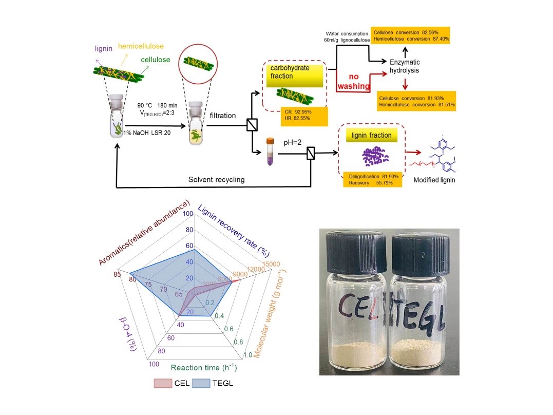 针对上述问题,德彩网生物质能生化转化研究室庄新姝研究员课题组率先提出了碱性木质素优先策略,并构建了新型的碱性三乙二醇/水(TEG/H2O)预处理体系。在温和条件(90 )下,甘蔗渣中90%以上的碳水化合物保留在固体残渣中,且无需洗涤即可直接高效酶解;制备得到的溶剂稳定木质素具有高效的热解活性。该研究实现了对甘蔗渣组分的有效拆解和回收,为生物炼制提供了一条绿色高效的组分分离路线。