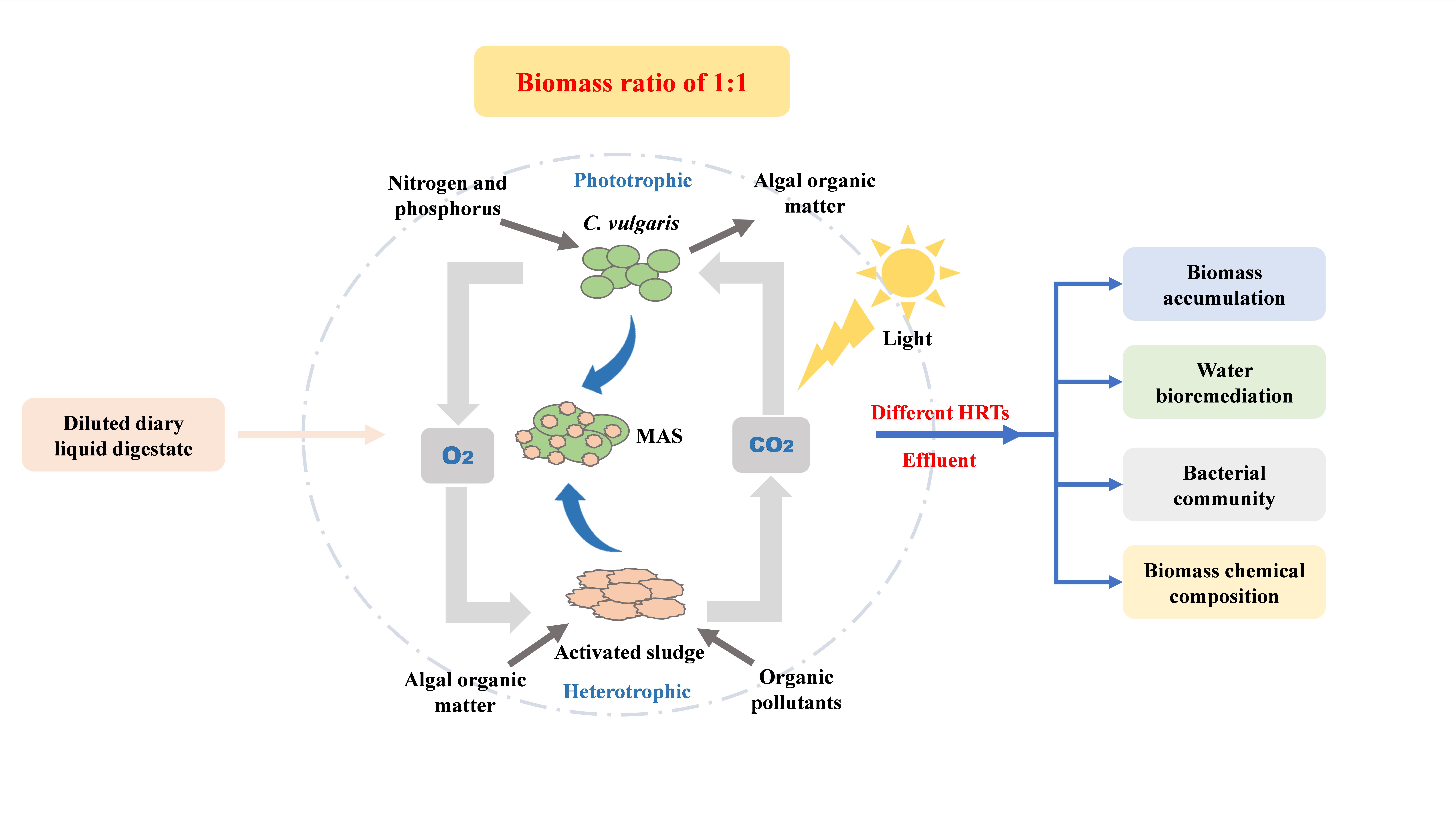 微藻和活性污泥(MAS)体系,构建简单,且能够有效去除污水中的氮、磷和COD等污染物而受到广泛关注。在污水处理中,水力停留时间(HRT)是一个至关重要的影响因素,直接影响污水处理性能、处理成本、微生物群落构建等。但迄今为止,对HRT在 MAS体系资源化处理实际污水中的作用鲜有研究。 近期,广州能源研究所研究人员将小球藻和活性污泥组成的MAS体系应用于奶牛场沼液处理,分别在3个不同HRT(4 天、6天和8天)下培养4个周期,以探究HRT在MAS资源化处理奶牛场沼液中的作用。研究结果表明, HRT为4-8天时,MAS生物质的增长主要归因于微藻,较长的HRT有助于MAS生物质的积累和氮磷的去除,HRT为8天时达到最高生物质产量(2.20-2.52 g/L)和最高营养去除(总氮和总磷的去除率分别为87.68 ± 4.57 % 和 100 %)。生物群落分析结果表明,HRT显著影响了细菌群落的丰度和多样性,HRT为6天时细菌群落的丰度和多样性最高。微藻的生长会选择性富集特定的细菌,Proteobacteria 和 Bacteroidetes在3个处理体系中均为最主要的菌门。HRT影响MAS生物质的生化组成,但对MAS生物质的热值影响并不显著。较长的HRT由于营养缺乏导致生物质中油脂的积累;较短HRT中营养物质充足,MAS生长较快,可以积累更多的多糖。 上述研究阐明了HRT对MAS体系资源化处理奶牛场沼液过程中生物质生产、污染物去除、细菌群落以及MAS生物质生化组成的影响,对MAS体系的实际应用以及在该连续处理过程中藻菌联合体的构建有重要意义。 以上研究成果以Role of hydraulic retention time in integration of microalgae and activated sludge process for nutrient recycle from diluted dairy liquid digestate为题发表于Chemical Engineering Journal期刊,德彩网生物质能生化转化研究室硕士毕业生冯思然为该论文第一作者,朱顺妮研究员和悉尼科技大学Huu Hao Ngo教授为共同通讯作者。该研究获得国家自然科学基金和国家重点研发项目的资助。 原文链接:https://doi.org/10.1016/j.cej.2024.149538