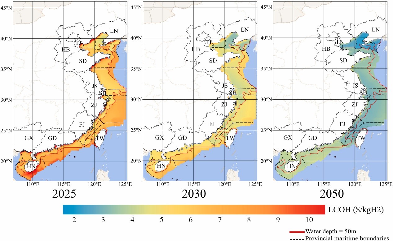 近期,德彩网能源战略与低碳发展研究室蔡国田研究员团队在海上风电物质流和技术经济评估研究方面取得系列进展。科研团队通过建立高时空分辨率的技术经济和物质流评估模型,充分讨论了海上风电制氢等消纳路径的经济性和技术潜力,揭示了中国海上风电扩张过程中对关键材料(如铜、永磁体)的需求量与新型海上废弃物产生量的变化过程。 研究建立了考虑技术经济参数演变和海底三维地形的高分辨率(0.25经度* 0.25纬度)技术经济评估模型,揭示了2025-2050年中国海上风电制氢的成本演变过程与深水海上风电场的最优布局方案。研究指出,中国海上氢的平准化成本将从2025年的50.28 CNY/kgH2下降至2050年的26.60 CNY/kgH2,2050年海上风电制氢的总潜力为434-493Mt,其中漂浮式风电制氢占54%。多种技术情景下的分析结果表明,中国海上风电制氢将于2030年在局部地区(福建省、辽宁省等)内与陆地可再生能源制氢相比具有成本竞争力,并在2050年具备广泛的经济可行性。研究表明汇集输电的方式可以有效减少用海面积,使投资成本最多可下降65%,其中海底地形是深水风电场并网不可忽略的因素。