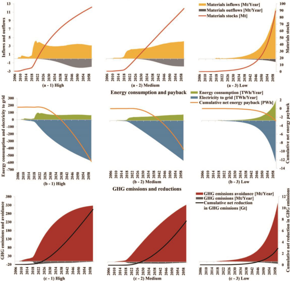 图2. 粤东深水区风电并网的空间布局优化方案 除此之外,研究提出了空间化、存量驱动中国海上风电高分辨率(1km*1km)物质流分析方法,建立了结合动态物质流和生命周期评价的清洁能源转型关键材料流动模型,揭示了中国海上风电发展和广东省清洁能源转型过程的物质-能量-排放关系。研究指出,到2060年中国海上风电的原材料累计需求为96-140 Mt,废弃物产生量为6.5-48 Mt,净能源回报为2.9-12 PWh,可减少温室排放2.9-9.7 Gt。研究表明中国海上风电对铜和永磁材料的累计需求分别为3.8-5.2 Mt和55-140 kt,关键材料的稳定供应与报废叶片的回收是实现海上风电进一步发展的前提。