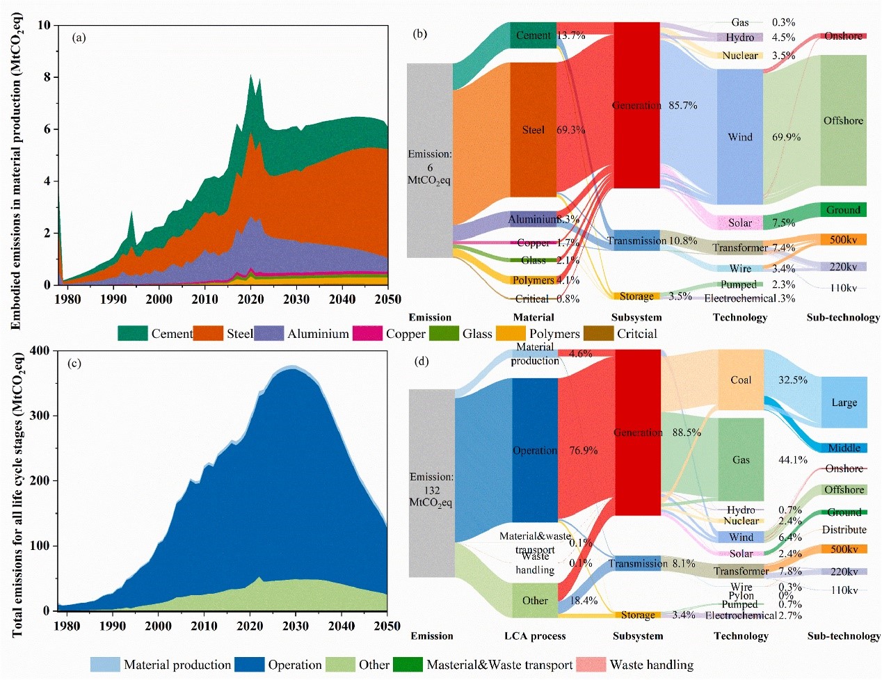 图3. 中国海上风电物质流分析结果 研究还指出,广东省的清洁能源转型使总材料的存量从1980年的2.9 Mt增加到2018年的45.6 Mt,并将于2050年达到95.7 Mt。清洁能源转型过程中风电和核能的大规模扩张会导致水泥和钢铁的用量急剧增加,全生命周期的总碳排放将逐渐下降,但能源基础设施的隐含碳排放会增加至6.06 Mt/yr。