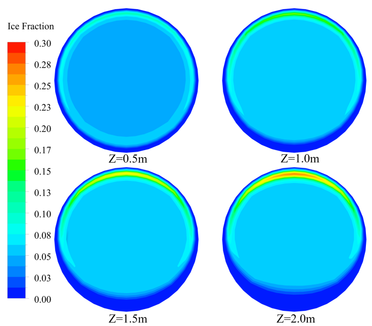沿流动方向不同位置的含冰率变化 研究获得重点研发计划(课题号:2021YFE0112500)、欧盟地平线项目(CO-COOL,课题号:No 101007976)等的资助。相关成果相继发表于Chemical Engineering Science(Ice nucleation in supercooled water under shear,https://doi.org/10.1016/j.ces.2024.120674,第一作者为陈明彪博士,通讯作者为宋文吉研究员),International Journal of Heat and Mass Transfer(Investigation on the evolution of ice particles and ice slurry flowcharacteristics during subcooling release,https://doi.org/10.1016/j.ijheatmasstransfer.2023.124008,第一作者为杜群博士生,通讯作者为宋文吉研究员)等期刊。 |