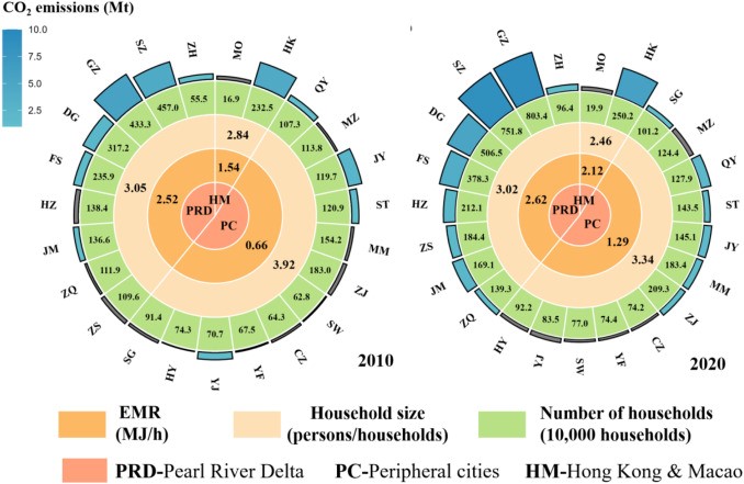 图1 居民生活能源碳排放研究框架的代谢角度解构 研究结果显示,2010年至2020年间,居民碳排放量几乎翻了一番,能源代谢率增长了1.5倍。在这些因素的分解中,总体家庭增长和能源代谢率是影响大湾区碳排放上升的主要正向驱动因素,分别贡献了60%和32%。不同地区之间存在显著差异,主要驱动因素包括能源代谢率、能源结构转变和家庭数量增加。针对大湾区城市发展的不同需求,研究提出了针对性的政策建议,包括通过数字技术建立居民减碳行为的实时动态核算体系、通过采用远程办公最大限度地减少通勤时间、使用节能家用电器和倡导采用智能家居技术推动城市间碳减排协调治理等。研究揭示了粤港澳大湾区居民生活碳排放特征,确定了关键驱动因素和影响,并为大湾区及周边城市的低碳城市发展和政策制定提供了政策建议。