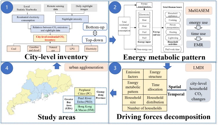近期,德彩网能源战略与碳资产研究中心蔡国田研究员团队在居民生活能源碳排放相关研究领域取得了新的研究成果。 鉴于不同区域在资源禀赋、主体功能、产业格局以及经济发展水平等方面存在显著差异,区域经济梯度差异为区域间居民生活变迁转移提供了内在动力。同时,区域间社会变迁导致的城镇化发展规模和生活方式差异的逐渐扩大,对区域间家庭部门居民资源利用产生了深远影响,进而促使区域居民生活碳排放格局发生转变。因此,在梳理区域碳排放责任时,必须考虑终端消费的家庭部门,以实现更加公平和客观的减排责任划分,并在区域宏观层面协调经济发展与资源环境的可持续利用。研究聚焦于区域间城乡居民生活碳排放的建模与应用研究,旨在扩展和完善我国在该领域的研究思路和模型方法,弥补现有研究的不足,为居民低碳消费和城市的低碳发展提供理论支撑。 研究详细展现了粤港澳大湾区(GBA)及周边城市(PC)的城市级居民碳排放量分析过程,研究过程涵盖了指导设计、数据收集、分析和解释等环节,采用城市级核算和时空分析方法。城市级核算利用消费数据、夜灯数据和排放系数计算每个城市的能源代谢和二氧化碳排放量,随后通过时空分析运用LMDI模型,探究居民碳排放随时间和空间变化的驱动力和变化趋势。