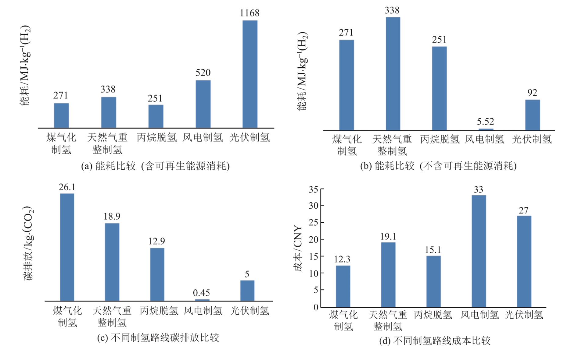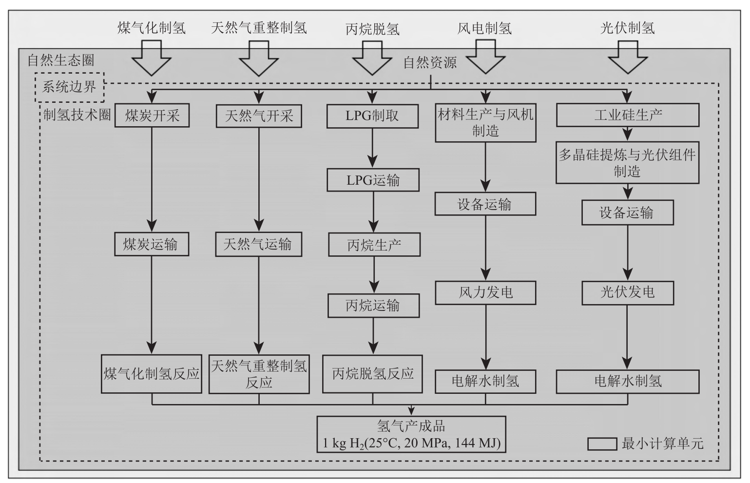 图 1 本研究所包含制氢技术路线及系统评价边界 研究结果表明,不同制氢路线在能源消耗和碳排放方面存在显著差异。若不将可再生能源视作能源投入,风电和光伏制氢的能耗和碳排放最低,尤其是风电制氢,其能耗仅为天然气重整制氢的1.6%,碳排放为煤气化制氢的1.7%。这意味着,可再生能源制氢不仅在减少碳排放方面具有重要优势,同时也具有显著的节能潜力。尽管风电和光伏制氢在节能减排方面具备竞争力,然而当前它们的制氢成本较高,主要受到电力价格的影响。