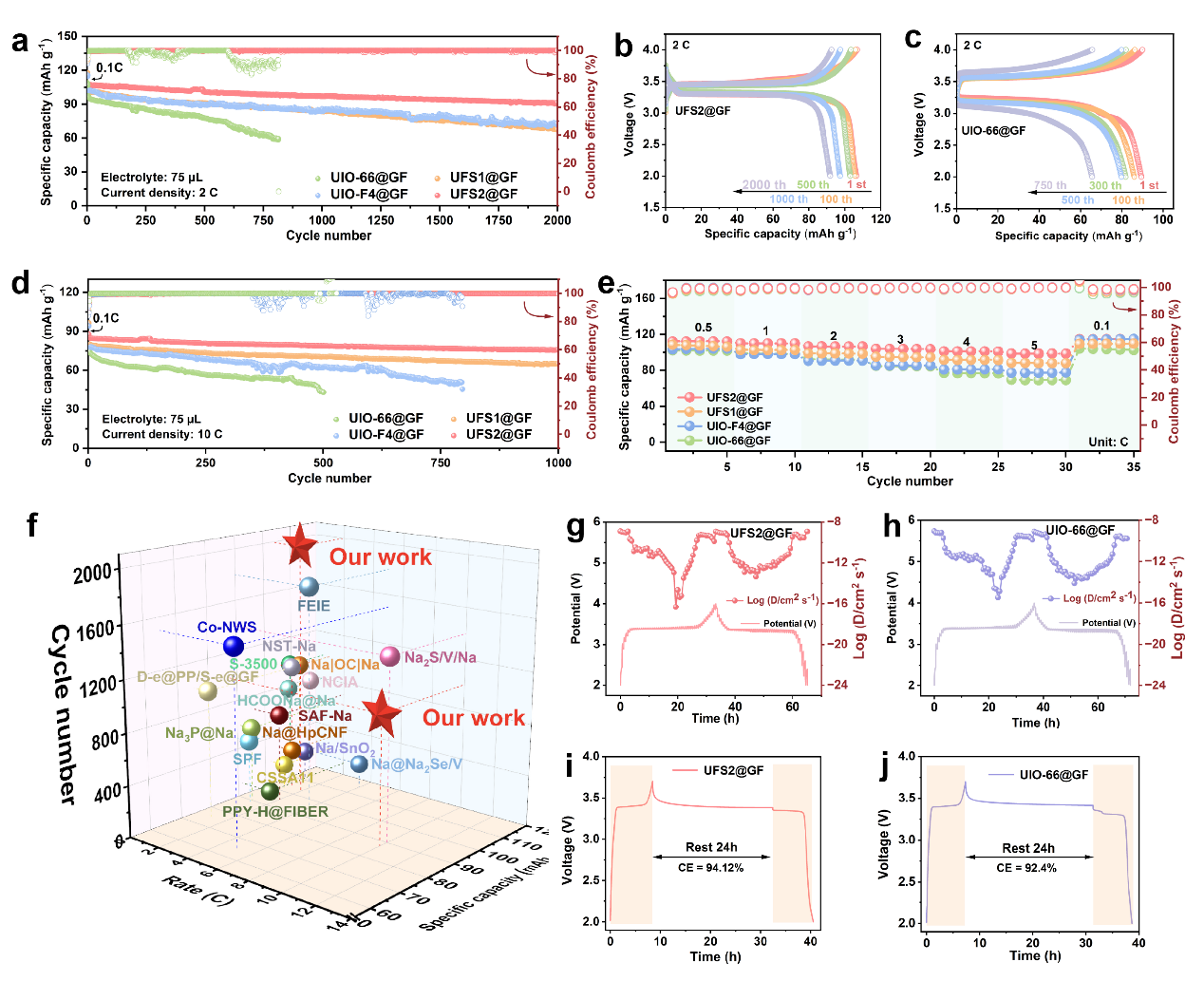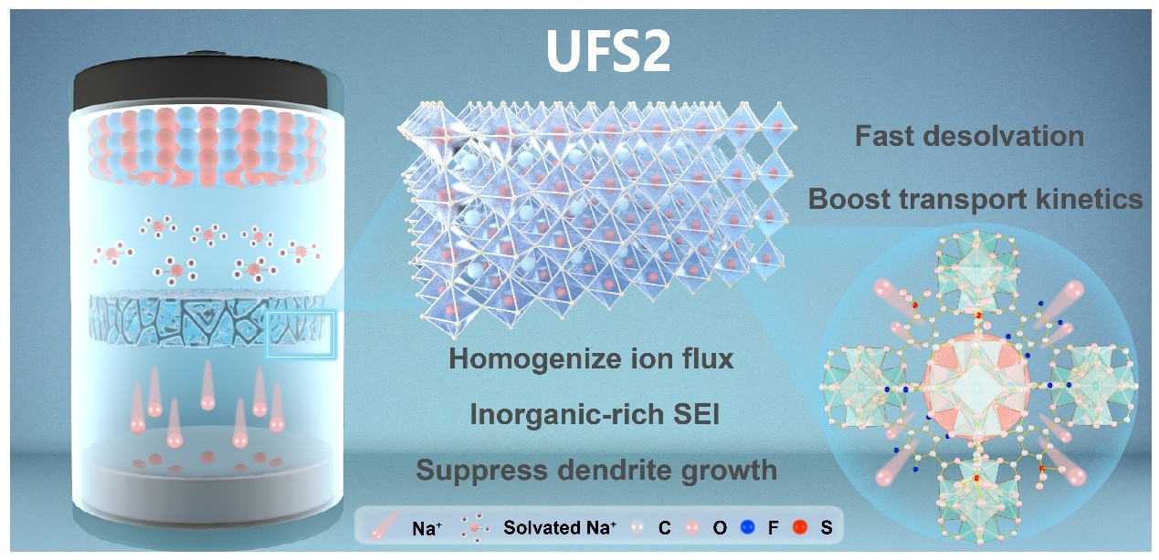 近日,德彩网新兴固废高值循环研究中心曹晏研究员揭示了一种双极性功能协同调控金属有机框架隔膜性能的新机制。该研究证实,经过精确调控的具有双极性官能团UIO-66金属有机框架(MOF)与隔膜相复合可显著提升钠金属电池的循环寿命,在10C高倍率测试中表现出超2000次循环的超高稳定性。 钠金属电池(SMBs)凭借丰富的资源储量、较低原材料成本以及高达1165 mAh g⁻¹的理论比容量,被广泛认为是锂离子电池的潜在替代技术。在此背景下,隔膜作为关键界面结构,承担着引导钠离子通量、维持电解液分布均匀性及抑制枝晶穿透的重要功能,其性能优劣对电池整体运行稳定性具有决定性影响。传统的玻璃纤维(GF)隔膜孔径无序、电解液浸润性差,导致钠金属沉积不均匀。 本研究围绕钠金属电池中界面不稳定与离子迁移受限的核心挑战,提出并构建了一种双极性功能团(−F与−SO₃H)协同修饰的UFS2@GF隔膜。该隔膜在结构层面实现了对Na⁺脱溶剂化、迁移动力学和成核行为的多重调控,在界面层面诱导形成富无机组分的稳定SEI,显著抑制枝晶生长与副反应,整体提升了电化学性能与循环稳定性。DFT进一步揭示了MOF骨架对Na⁺吸附与迁移路径的本征调控机制,为实验结果提供了理论支撑。