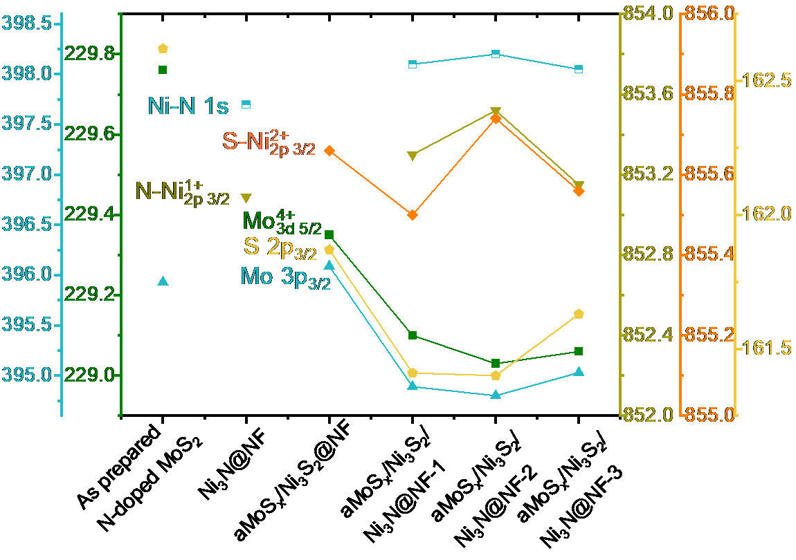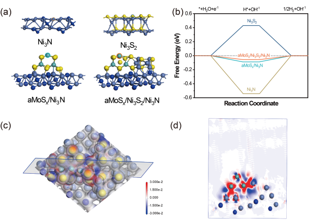 开发高效水电解析氢催化剂是突破制氢成本瓶颈、加速氢能经济规模化落地的核心路径。异质界面工程可通过电荷重排优化中间体吸附能提升析氢(HER)性能,但三相体系中组分协同机制与“组分界面-性能”构效关系仍不明确,且异质结微观结构的电荷转移与物质传递协同优化策略亟待突破。 针对上述问题,德彩网制氢与利用科研团队提出“结构-界面同步优化”策略,构建了三相异质结催化剂a-MoSₓ/Ni3S2/Ni3N@NF-2。通过调控前驱体比例实现组分/形貌可控合成,建立三维导电网络和超亲水疏气表面,显著提升活性位点暴露率与气泡脱附速率(图1)。研究表明:Ni3S2可调控中间体吸附能,其比例调控可诱导强界面电子相互作用。XPS与DFT计算证实(图2),Mo位点电子密度提升使氢吸附自由能(ΔGH*)降低至-0.06 eV,接近铂基催化剂理论值。