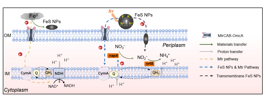 系统功能基因表达示意图 在进一步在可见光调控下(λ=395 nm),该体系实现了硝酸盐的反硝化与异化还原为铵的双路径协同。研究发现在光照下通过S. oneidensis菌自组装形成的FeS纳米颗粒介导微生物电子跨膜传递,从而提升电子利用效率。该体系实现了平均63.8 mg N/d/L的硝酸盐去除率,以及27.1%的铵氮回收效率。更重要的是,该系统还成功与实际污水活性污泥耦合,在模拟废水中表现出优异的脱氮(233.3 mg N/d/L),显示出较强的工程应用潜力。