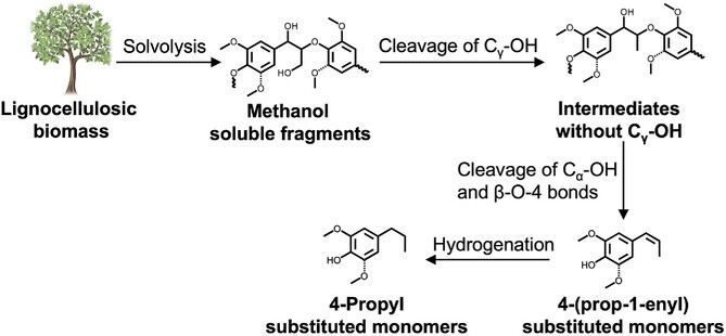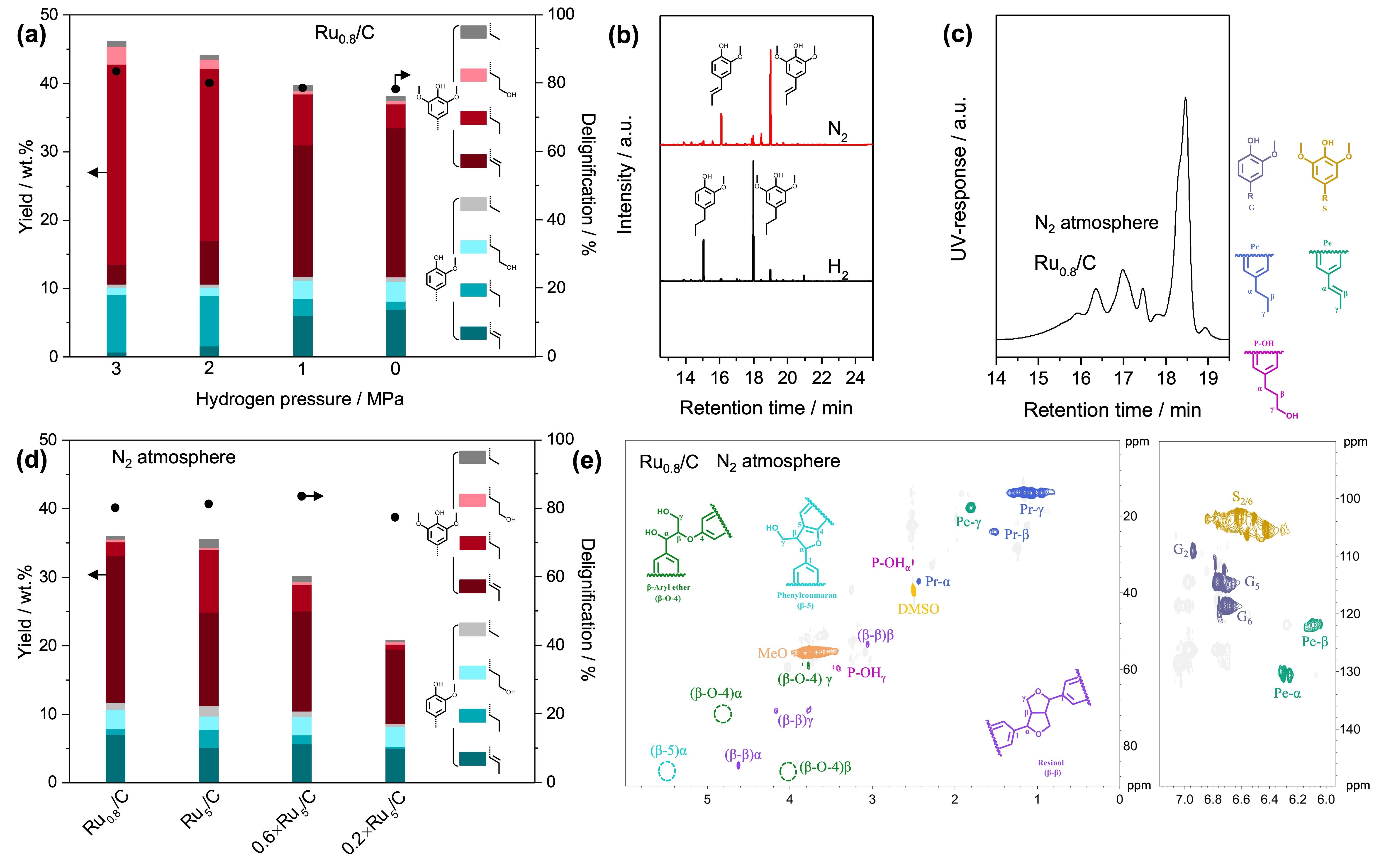 木质纤维素类生物质是一种储量丰富的有机可再生碳资源,主要包含纤维素、半纤维素和木质素三大组分,是制备可持续燃料、化学品和材料的理想原料。由于这类生物质的结构复杂且致密,通过分离技术打破复杂结构是实现选择性转化全组分的基础,然而当前大多数组分分离和转化技术聚焦于纤维素和半纤维素的高值化利用,其分离转化过程中木质素往往发生不可控重聚,导致其高值化利用难以实现。 针对上述问题,德彩网廖玉河研究员等人联合东南大学开发了低负载量的钌基催化剂用于催化分离生物质,实现了在氢气和氮气条件下选择性转化生物质中木质素分别得到高收率的4-丙基取代单酚和4-丙烯基取代单酚,同时保留了纤维素(>90%)和半纤维素(>75%)。这些纤维素和半纤维素可以被进一步转化,有望实现全组分高值化利用。该技术适用于桦木、杨木、松木和玉米秸秆等多种生物质原料。同时,开展了转化不同结构的木质素模型化合物和氘代实验研究,揭示了木质素分离解聚路径。该研究工作为木质纤维素类生物质组分的选择性分离和木质素定向解聚的催化剂开发提供了新思路。