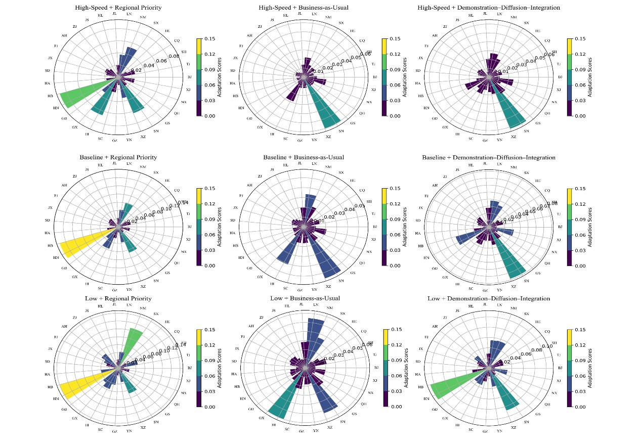 图2:在不同区域扩散情景下动力电池储能适配性的评估 其次,研究团队构建了退役电池供应与储能需求的匹配模型,综合评估了区域光伏装机量、电网调峰需求以及储能政策,提出了“电池适配度”指标。研究发现,北京、广东等地区存在退役电池资源过剩的风险,而西北等地区则面临电池资源不足的问题,建议推进跨区域的梯次电池再分配机制。此外,通过模拟多种政策路径和区域扩散策略,验证了因地制宜的政策措施明显优于统一政策,并提出了区域性调控建议。