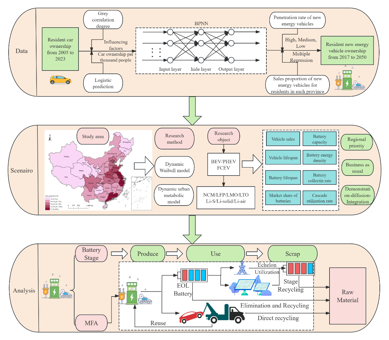 图1:中国家用新能源汽车动力电池管理研究框架:基于情景的梯次利用、储能潜力与退役回收优化路径评估 首先,研究团队通过全生命周期建模方法,系统分析了电动汽车与电池退役生命周期的差异,分别研究了整车退役、电池提前更换和电池二次退役的情景,精确预测各省电池的退役时间节点和规模,为区域回收基地布局提供数据支撑。同时,该研究还综合考虑磷酸铁锂、高镍三元、固态电池等不同类型电池的发展趋势,分析了电动化路径不同情景下的电池退役节奏,明确了对回收体系的不同影响。