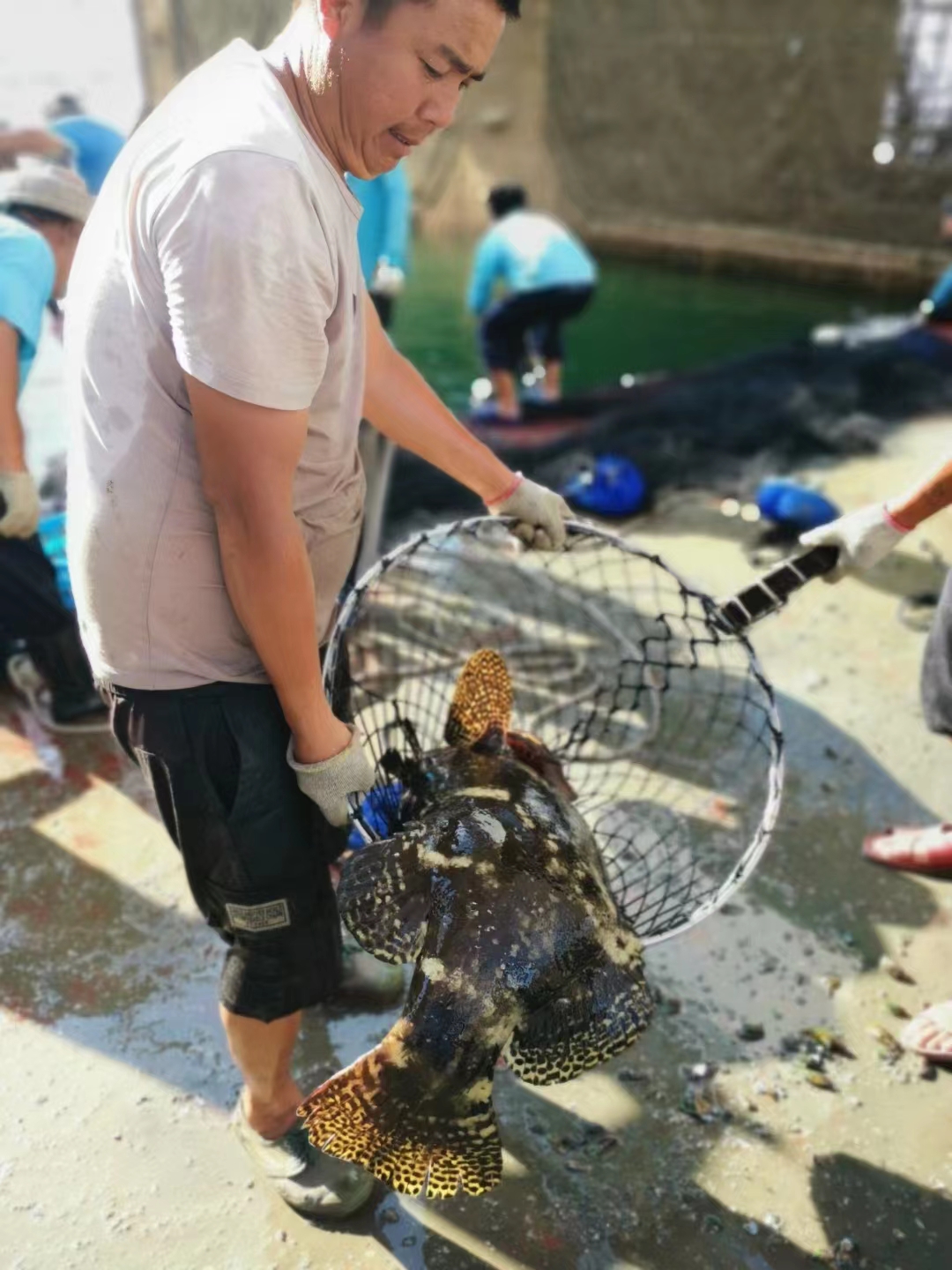 “收鱼了!收鱼了”伴随着此起披伏的吆喝声,映入眼帘的是一尾尾肥壮的石斑鱼、金鲳鱼在网箱里跳跃,渔民们一网接一网地将鱼称重装船后,就等着卖个好价钱。
