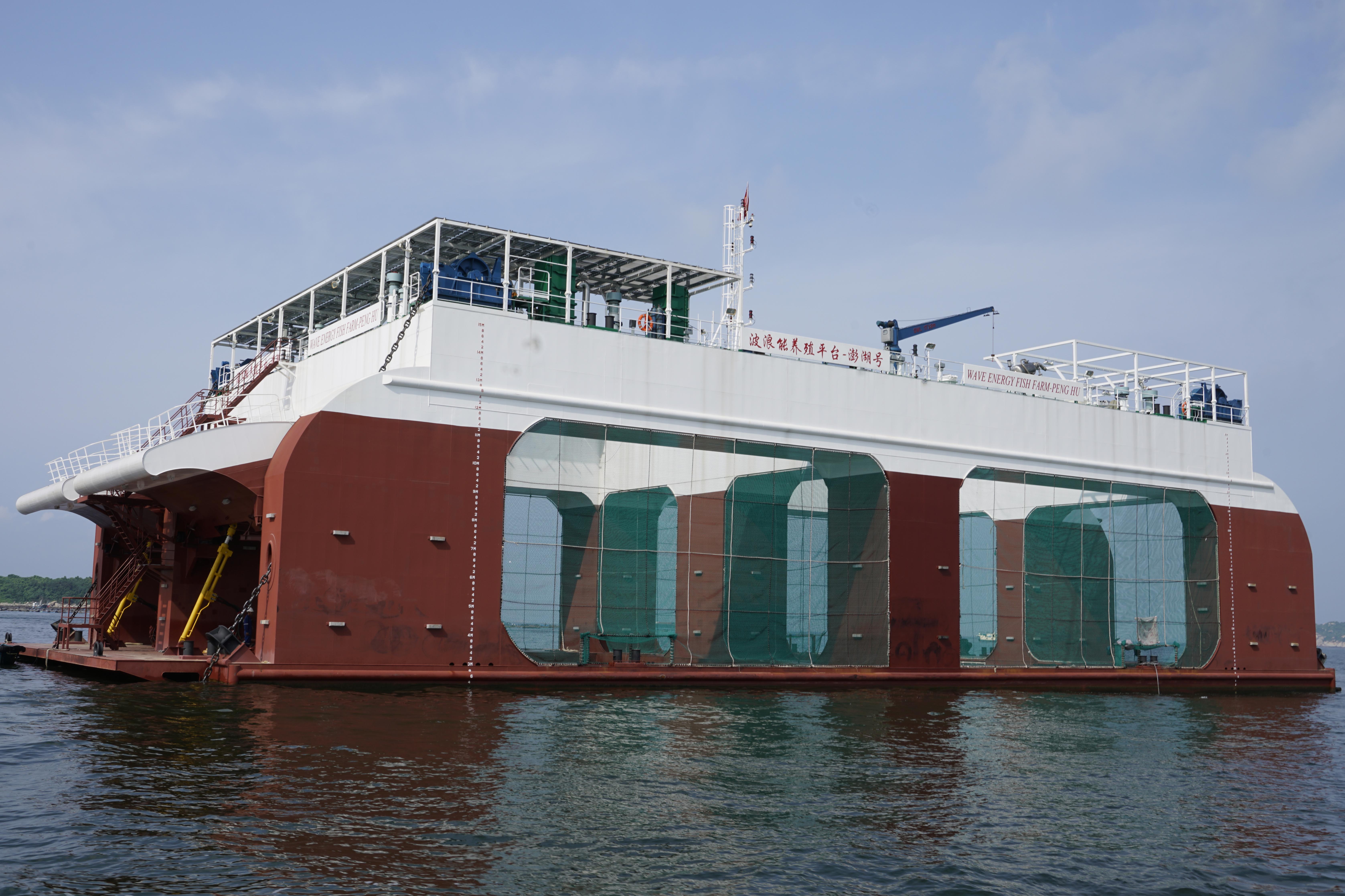 “澎湖号”长66米,宽28米,高16米,工作吃水12米,采用钢结构加软体网结合形成养殖水体,可提供1.5万立方米养殖水体,搭载可再生能源装机120kW,其中波浪能装机60kW,太阳能装机60kW,能源自给自足,全部来源于海上可再生能源。