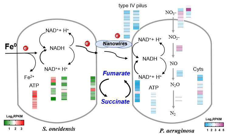 针对上述问题,研究团队构建了电活性菌Shewanella oneidensis和反硝化菌Pseudomonas aeruginosa共培养体系,以零价铁作为唯一电子供体,硝酸盐作为唯一电子受体,探究了“嗜铁”反硝化可行性及其反应机理。研究发现,S. oneidensis菌可作为生物引擎,收集并释放铁腐蚀产生的电子,用于P. aeruginosa菌脱氮过程。宏转录组学分析手段显示,微生物电共生过程调控编码反硝化酶、胞内电子转移蛋白以及群体感应的基因表达,对微生物脱氮具有重要作用。