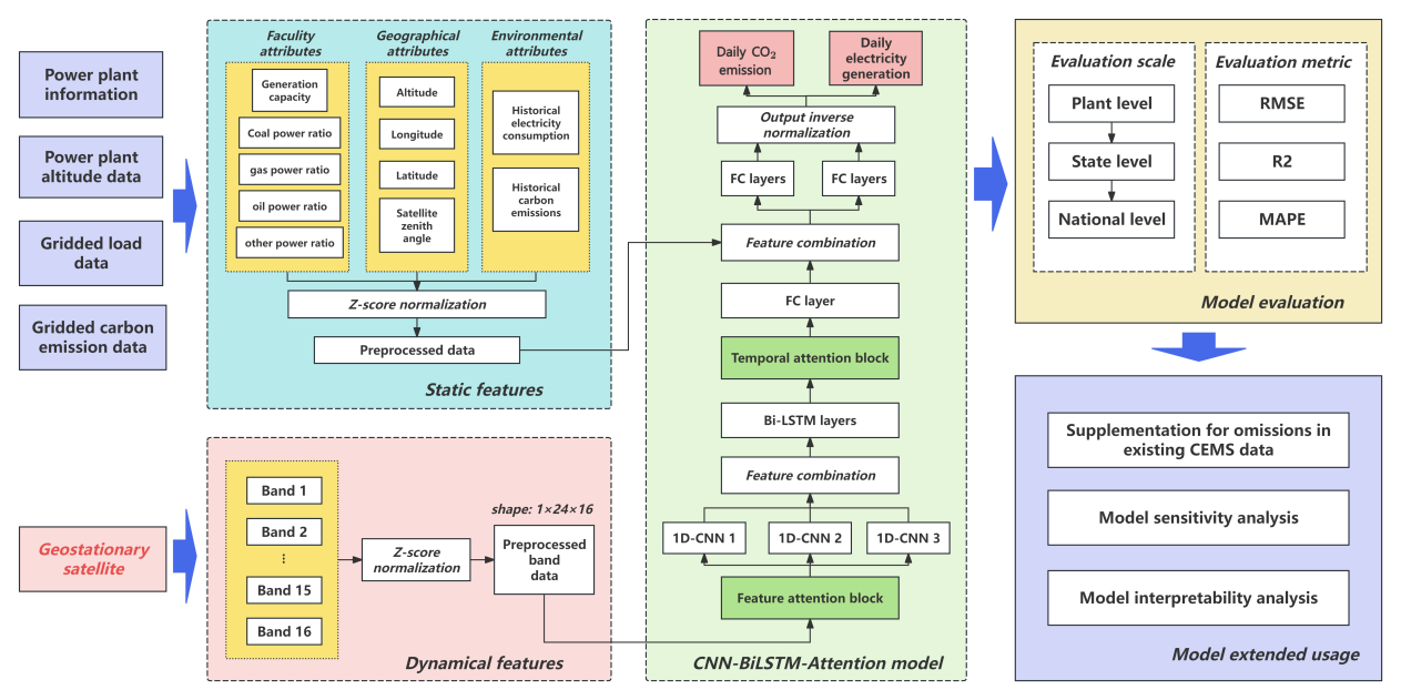 研究人员以美国环境保护署管理的火电厂为研究对象,采用GOES-16地球静止卫星提供的多光谱遥感数据及火电厂相关静态信息作为模型输入,以火电厂日尺度的碳排放与发电量数据为预测目标,构建端到端的监测框架。在算法设计上,模型融合了卷积神经网络、双向长短期记忆网络和特征与时间双重注意力机制,显著提升了模型测算的准确性与鲁棒性。