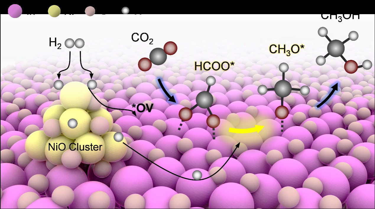 氧化镍团簇增强二氧化碳加氢制备甲醇性能示意图。研究团队供图