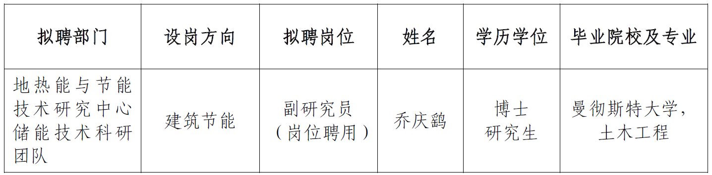 根据研究所岗位聘用工作有关规定及《德彩网地热能与节能技术研究中心高层次人才招聘启事》要求,拟聘用以下人员到我单位工作,现予公示。
