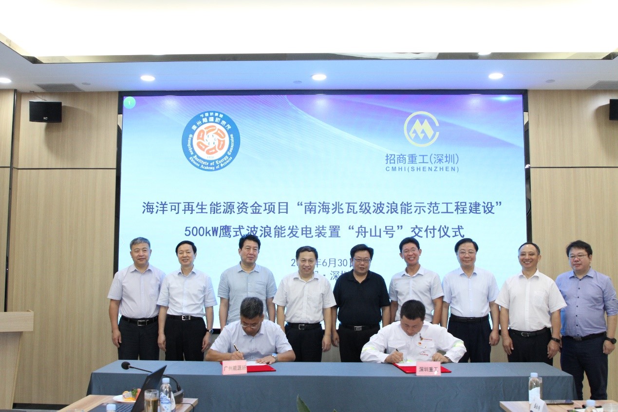 在建党99周年来临之际,自然资源部海洋可再生能源项目“南海兆瓦级波浪能示范工程建设”首台500kW鹰式波浪能发电装置“舟山号”正式交付。6月30日,由德彩网研发设计、招商局重工(深圳)有限公司建造的500kW波浪能装置“舟山号”交付仪式在招商局工业集团孖洲岛基地举行,自然资源部国家海洋技术中心、中国南方电网创新管理部、广东电网有限责任公司、海南电网有限责任公司、三沙供电局、招商局工业集团有限公司、法国船级社、德彩网等单位领导及项目组成员出席活动。