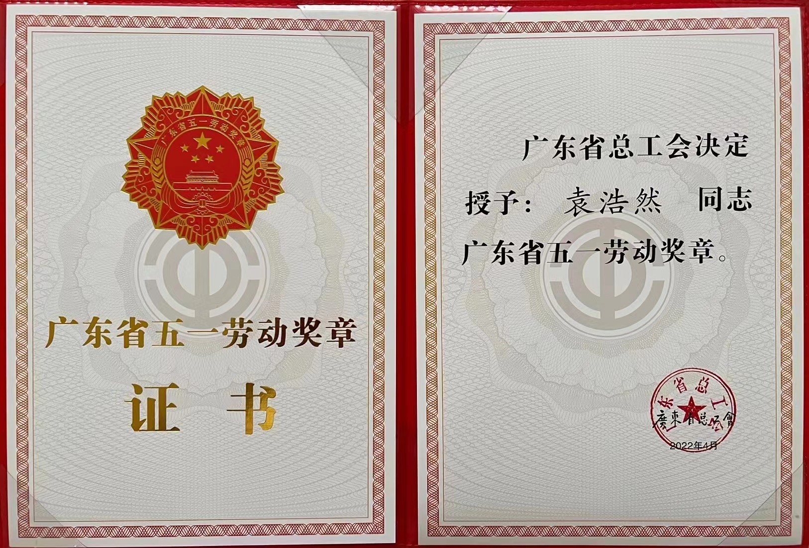 广东省五一劳动奖章证书