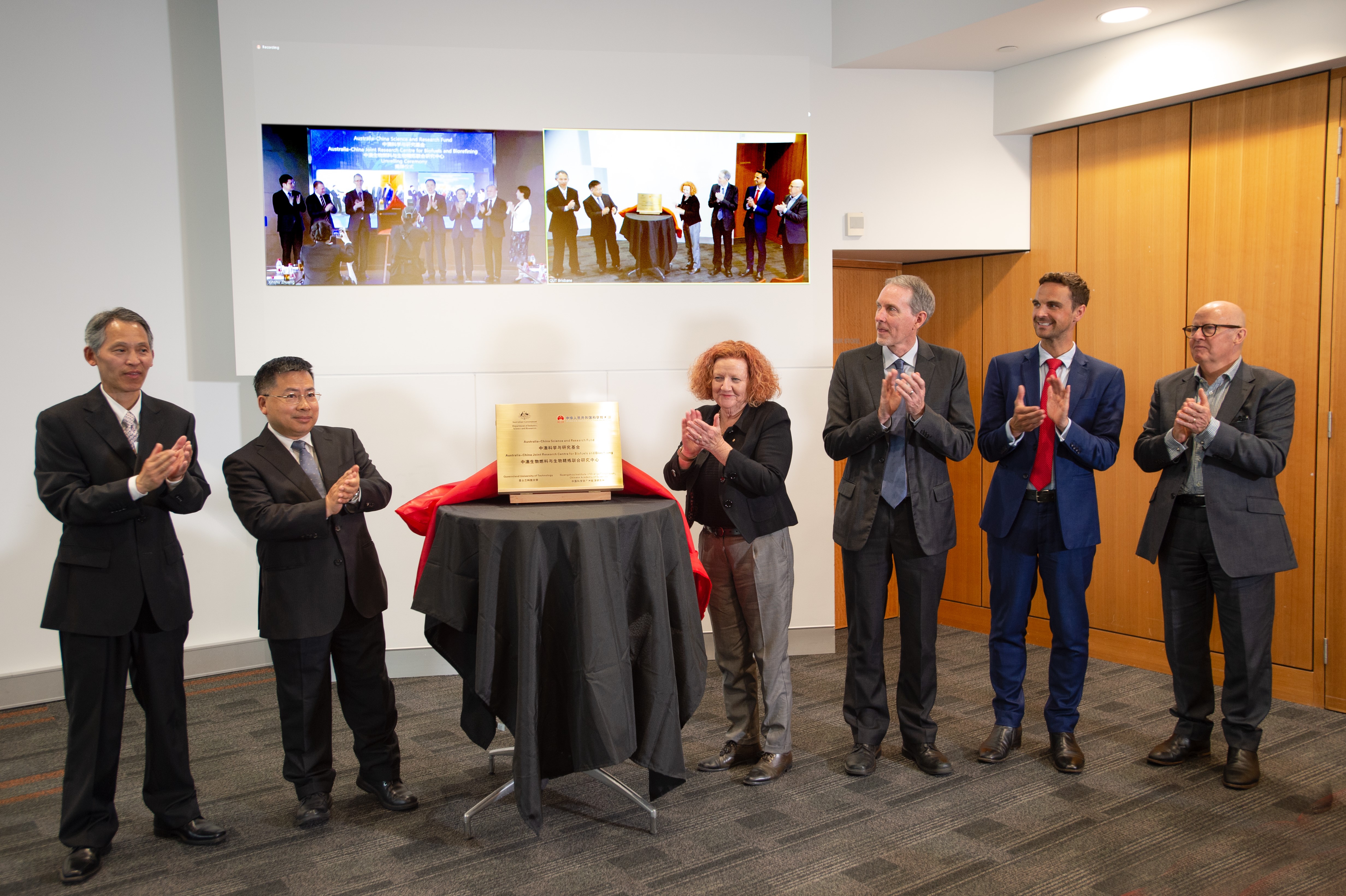 在中方现场参会的重要嘉宾包括澳大利亚驻华大使傅关汉(Graham Fletcher)、澳大利亚驻广州总领事邓安义(Anthony Aspden)、澳大利亚驻华大使馆工业科技和资源部参赞贺雅诗(Esther Harvey)、中国科技部国际合作司副司长徐捷、广东省科技厅副厅长梁勤儒、中国科学技术交流中心美大处处长李宁、中国科学院国际合作局美大处处长宁博伦、中国科学院德彩网所长吕建成及副所长黄宏宇等;在澳方现场参会的有中国驻澳大利亚大使馆公参蔡嘉宁、中国驻布里斯班总领事阮宗泽、澳工业科学和资源部国际科学与资源司副司长Richard Samuels、昆士兰科技大学校长Margaret Sheil AO等。仪式活动由中澳双方项目负责人庄新姝研究员和Ian O’Hara教授共同主持,共60余人出席活动,一起见证了这个具有重要意义的时刻。