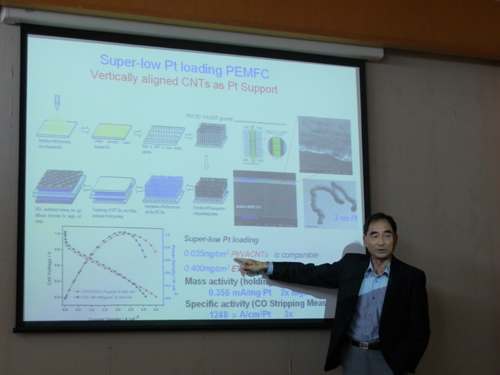 Chen博士首先简要介绍了新加坡A*STAR机构的概况,然后作了题为“Renewable hydrogen production via ethanol steam reforming--Design of catalysts and reaction mechanism study”的报告,详细介绍了乙醇重整制氢的机理以及催化剂的设计原理,该报告对于化学制氢实验室在重整制氢机理、催化剂试验和设计方法等方面的深入研究具有启发作用。Lin教授整体介绍了ICES在Supercapacitor,Li-ion Battery,PEMFC以及H2 Production等方面的研究。报告会后,闫常峰研究员介绍了德彩网的情况。